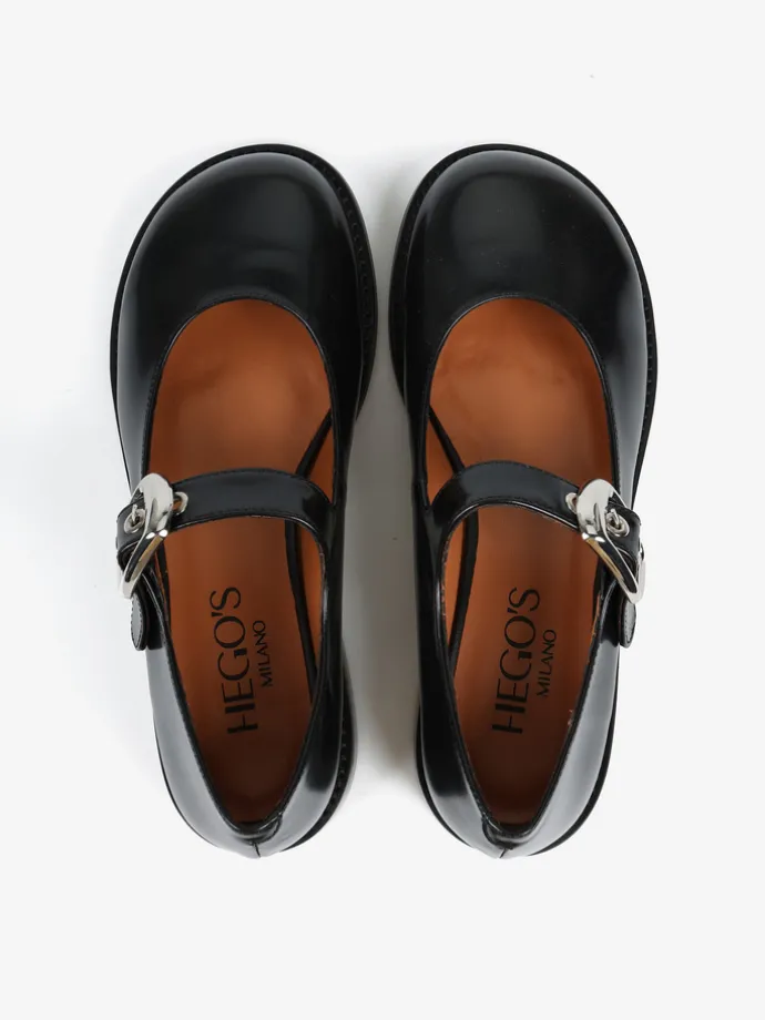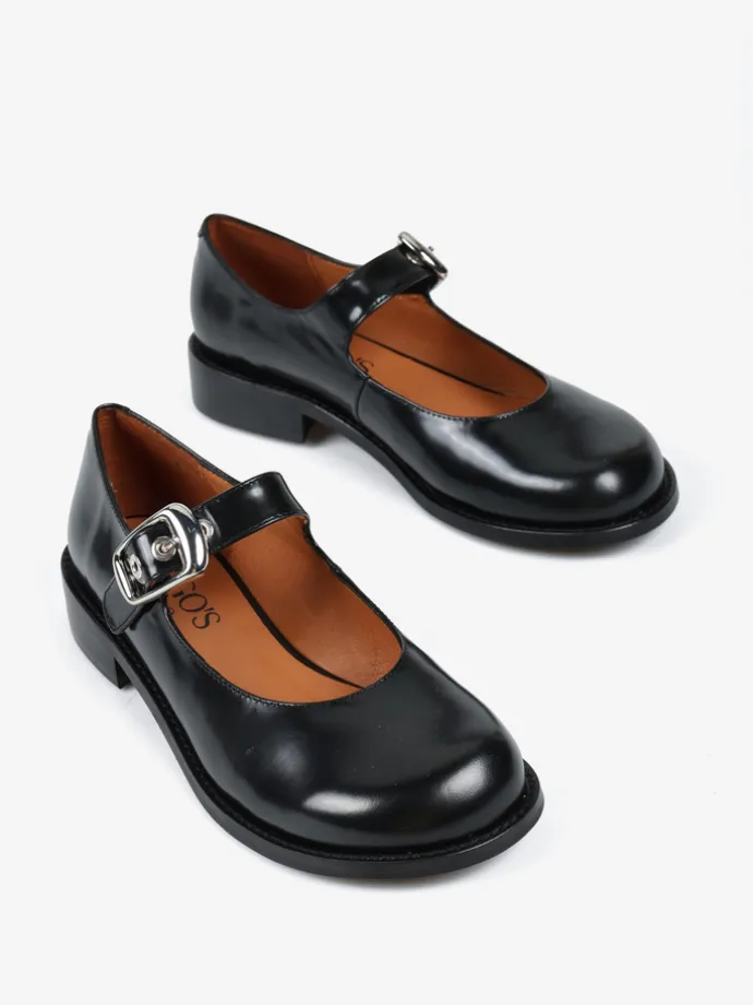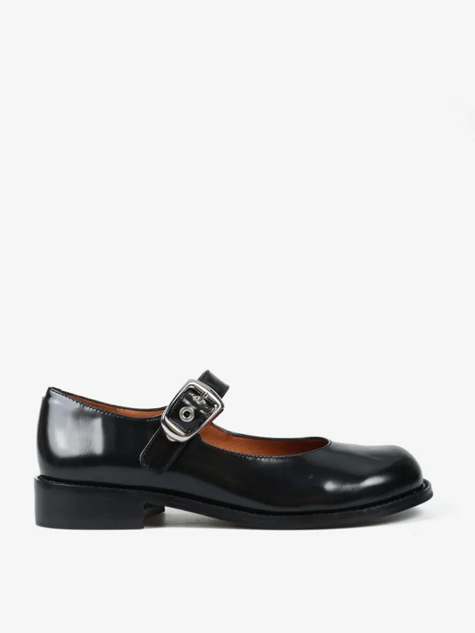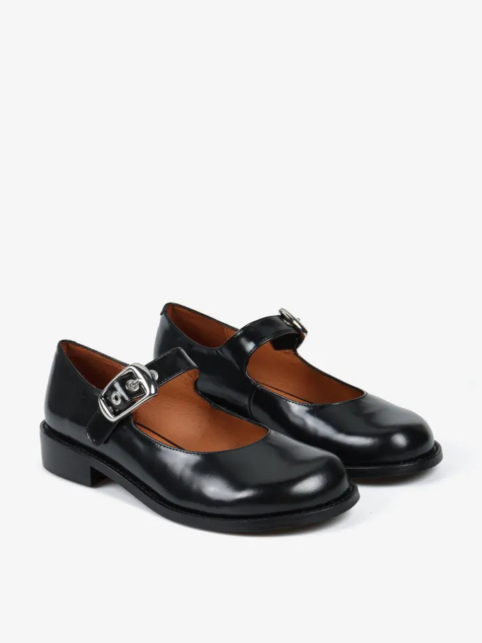 Baleriny Mary Jane na niskim obcasie, wykonane z wysokopolerowanej skóry. Okrągłe noski i regulowany pasek.