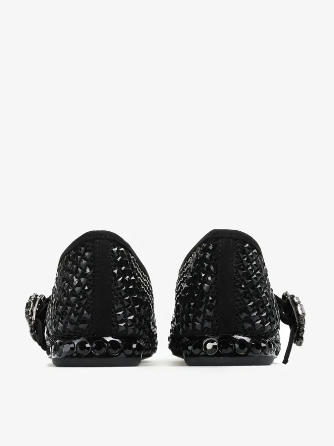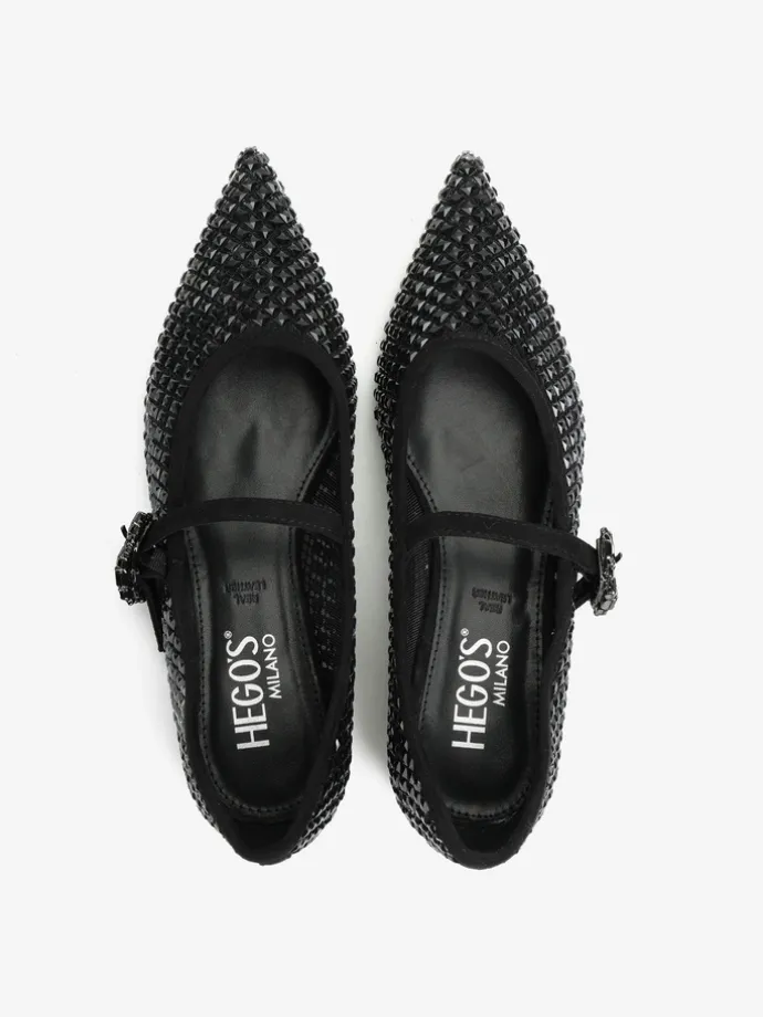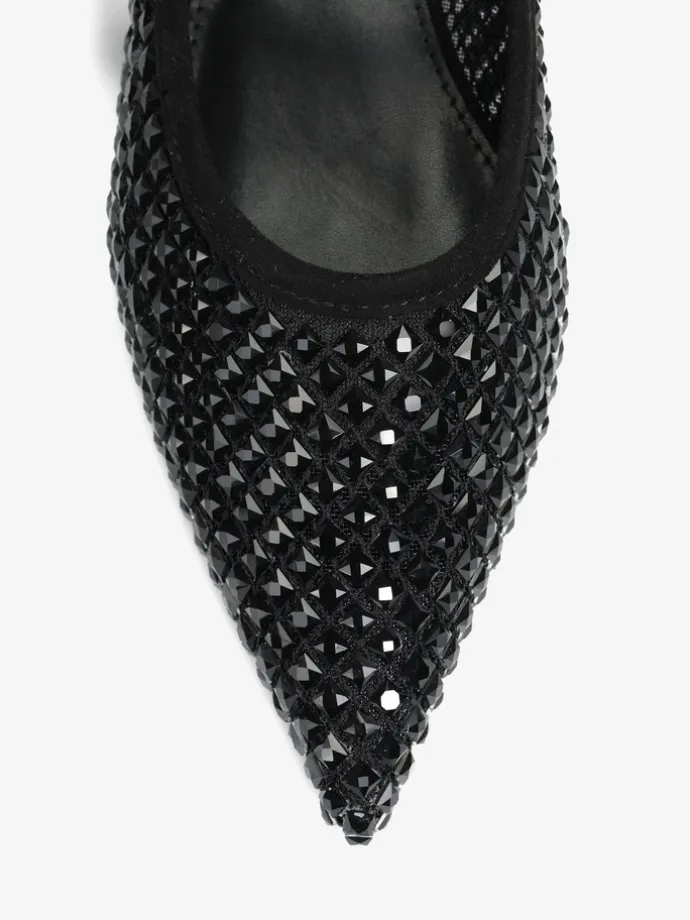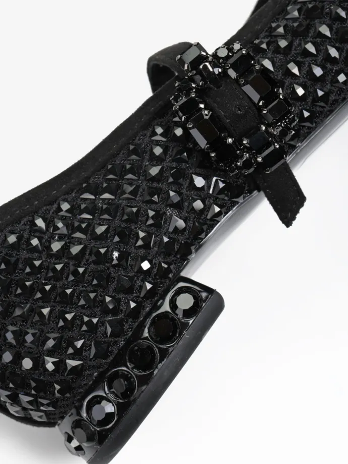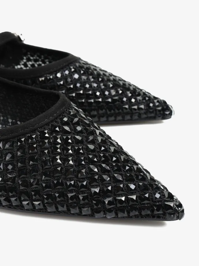 Baleriny Mary Jane wykonane z siateczki zdobionej kryształkami. Noski w szpic, niski obcas i regulowany pasek.