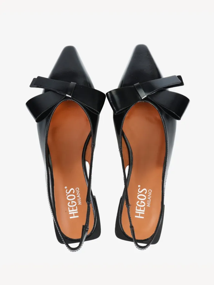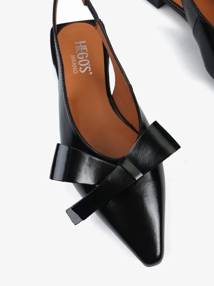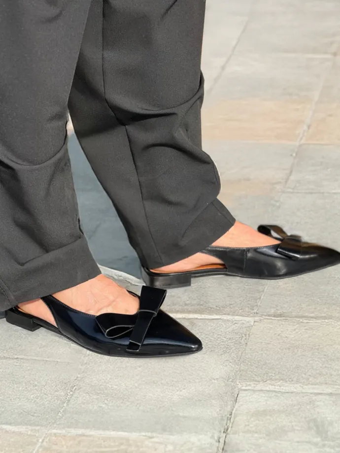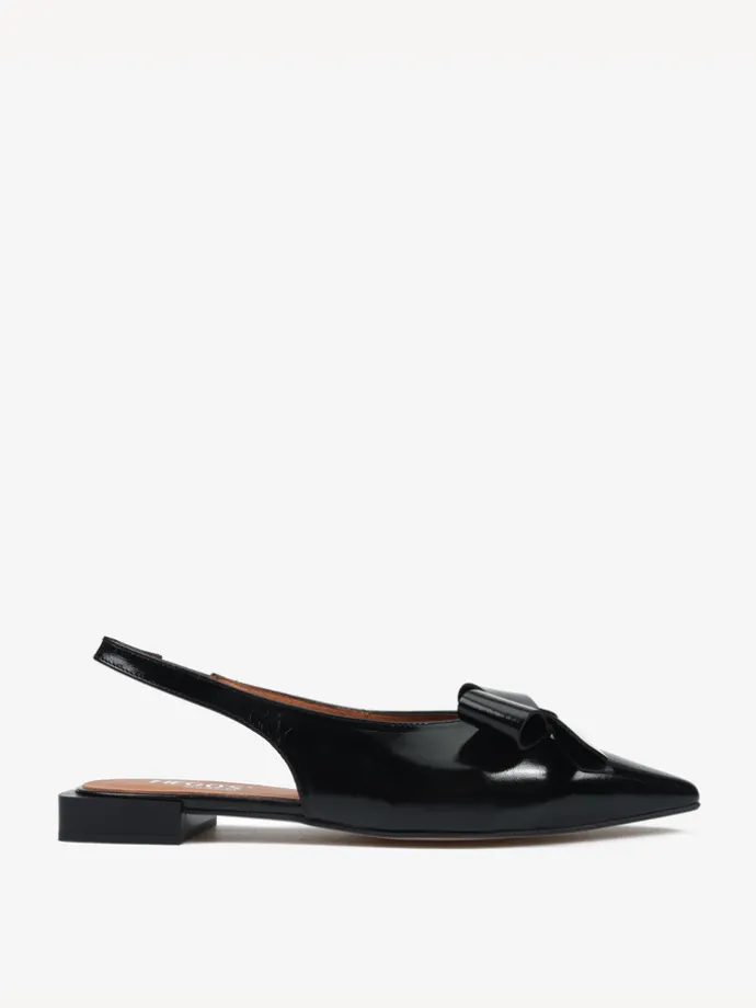 Baleriny z noskiem w szpic i ozdobną kokardą wykonane z wysokopolerowanej skóry. Odkryta pięta z paskiem dopasowującym się do stopy.