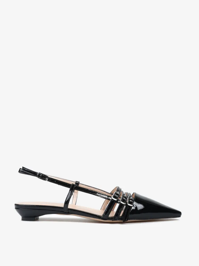 Baleriny z noskiem w szpic i odkrytą piętą z regulowanym paskiem. Ozdobne paseczki.