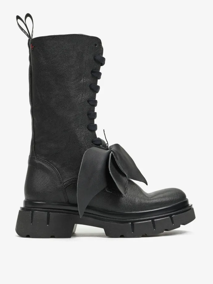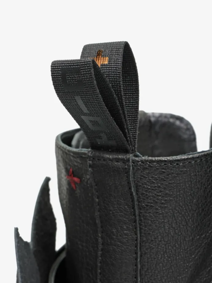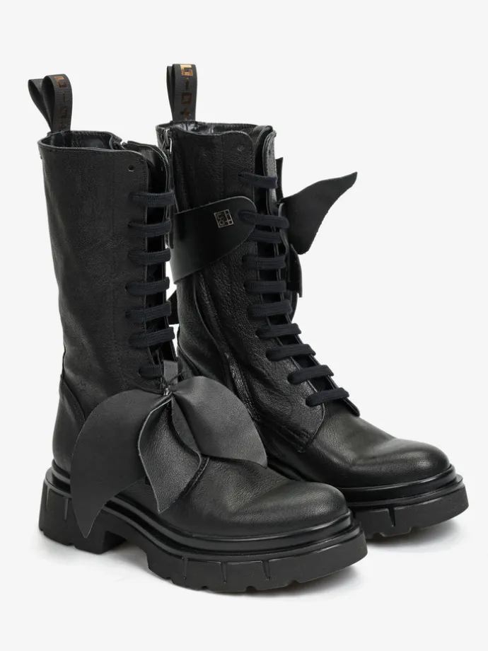 Skórzane botki GIO+ na grubej podeszwie. Wysoka cholewa z zapięciem na suwak. Ozdobne, skórzane kwiaty.