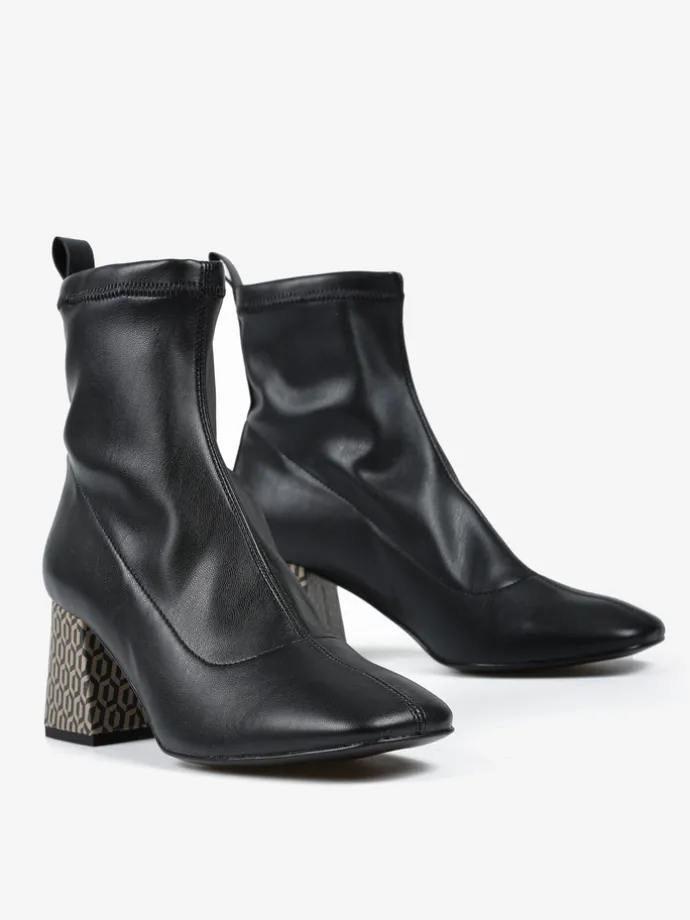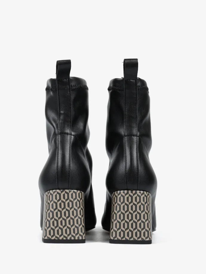 Wsuwane botki z kwadratowymi noskami. Efektowny słupek w geometryczny wzór.