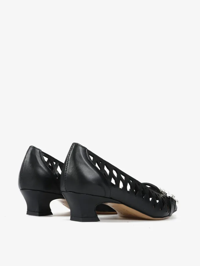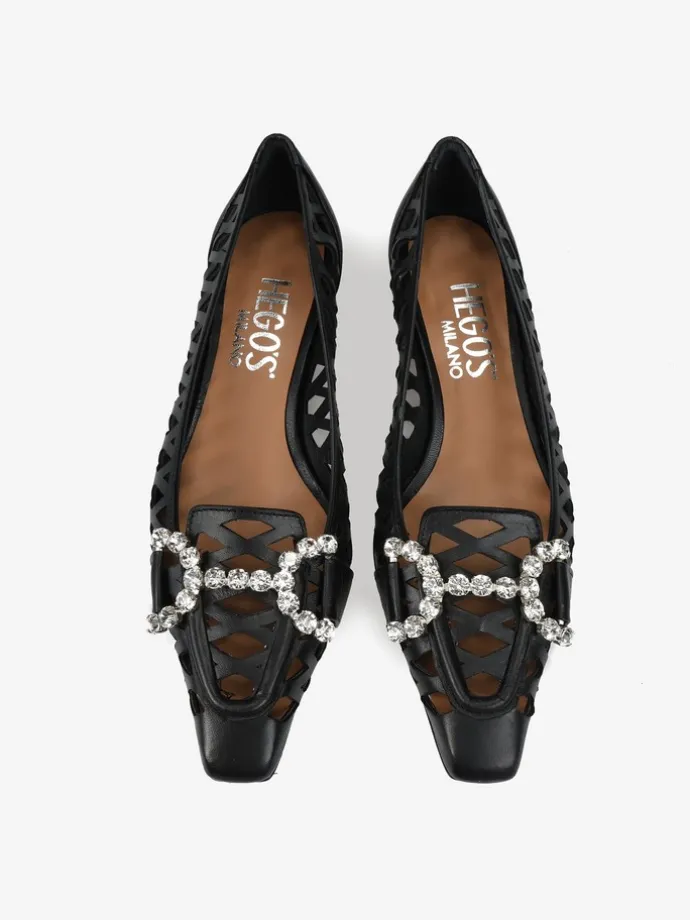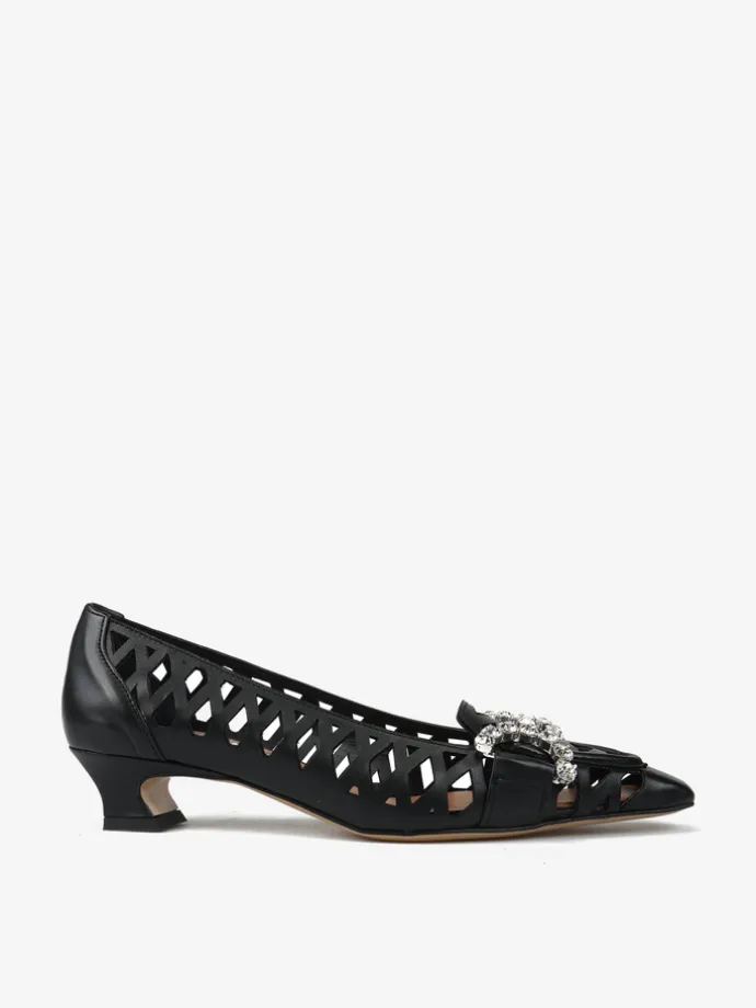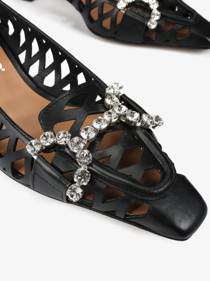 Miękkie, skórzane czółenka na niskim obcasie z ozdobną aplikacją. Wydłużony, kwadratowy nosek.