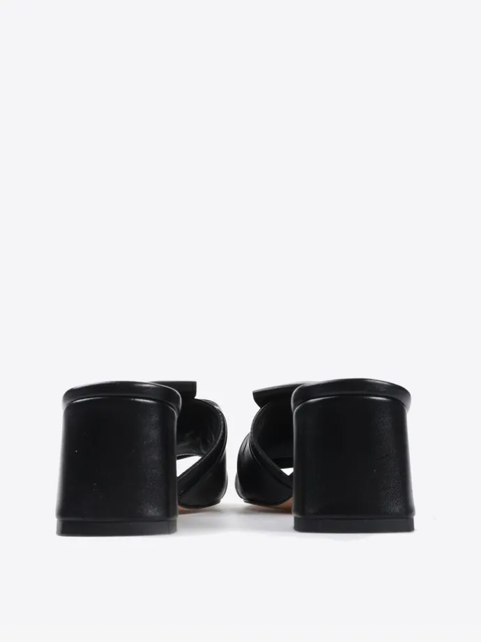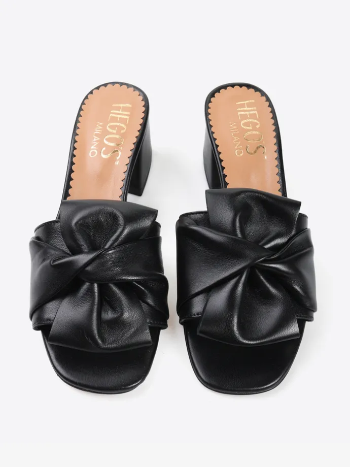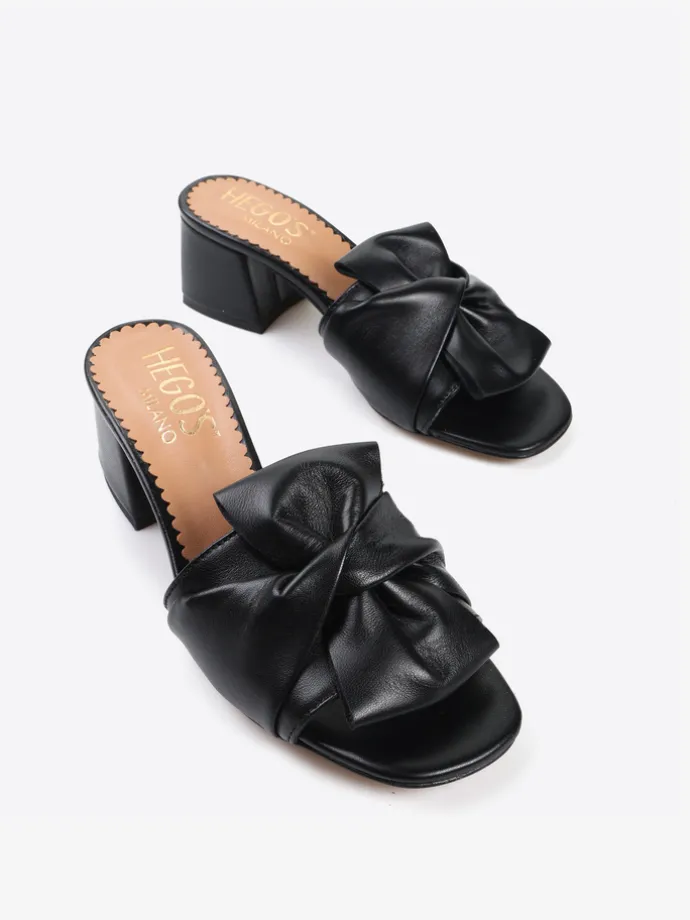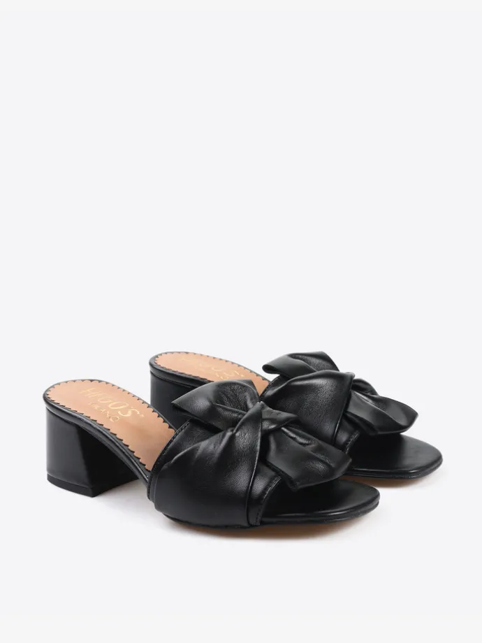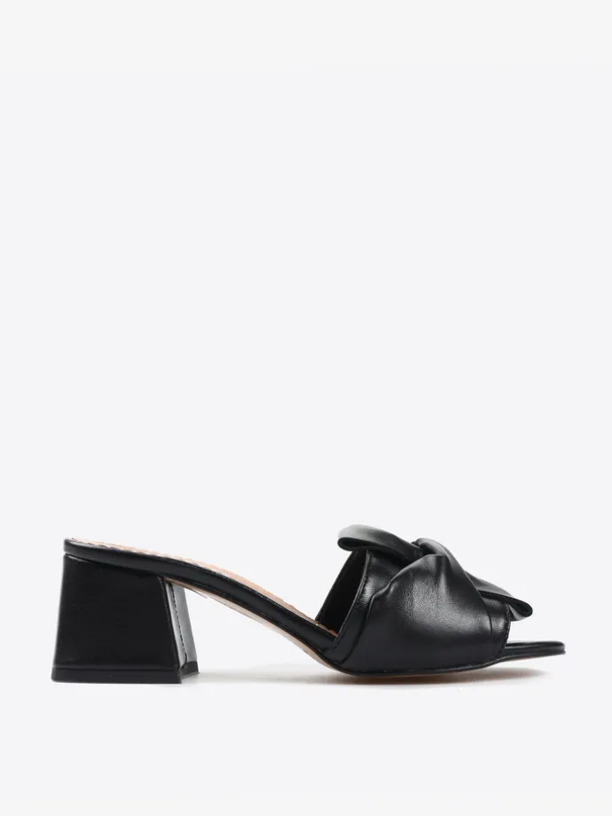 Klapki na obcasie wykonane z miękkiej, delikatnej skóry. Pasek z ozdobnym wiązaniem.