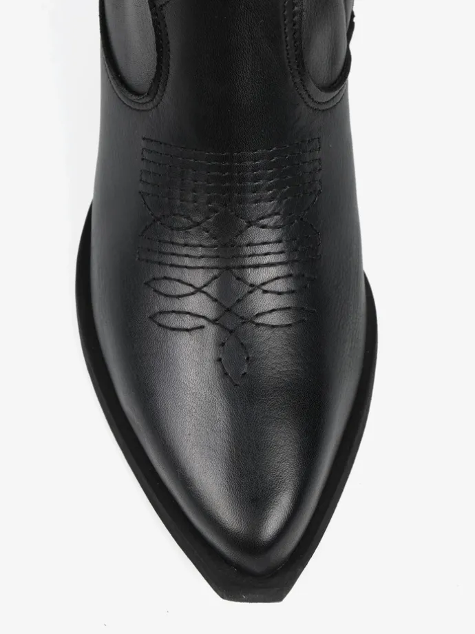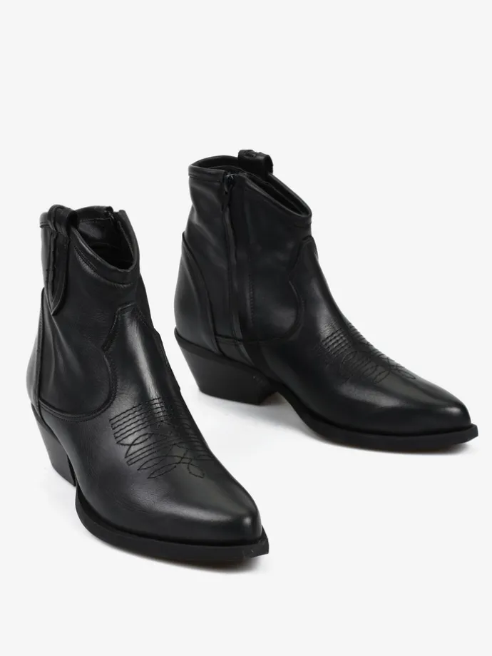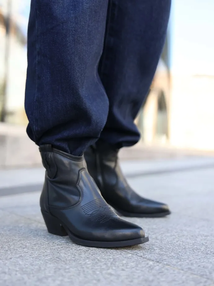 Niskie, skórzane kowbojki z monochromatycznym haftem na nosku i zapięciem na suwak przy kostce.