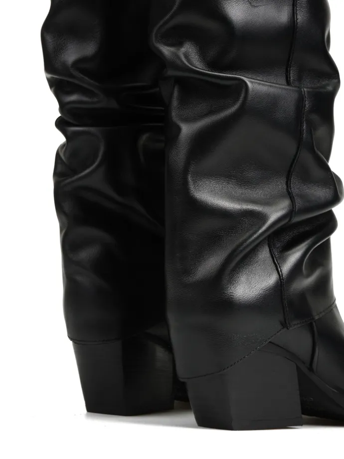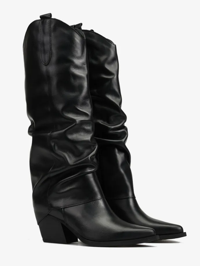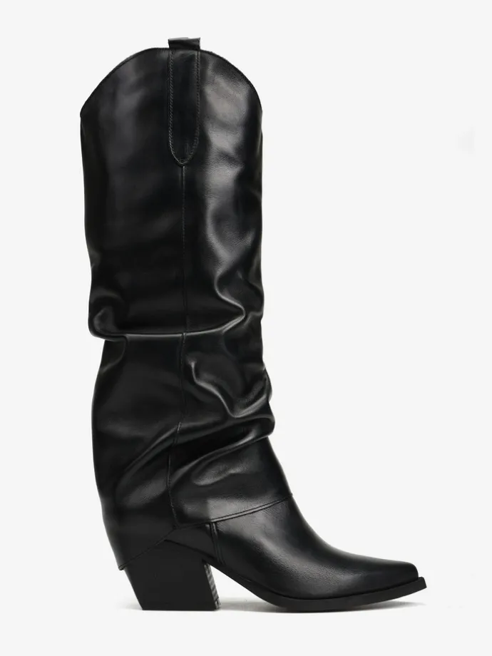Skórzane kowbojki z przedłużoną, marszczoną cholewką. Noski w szpic.