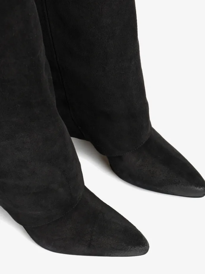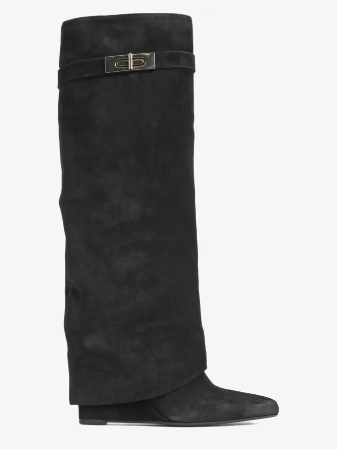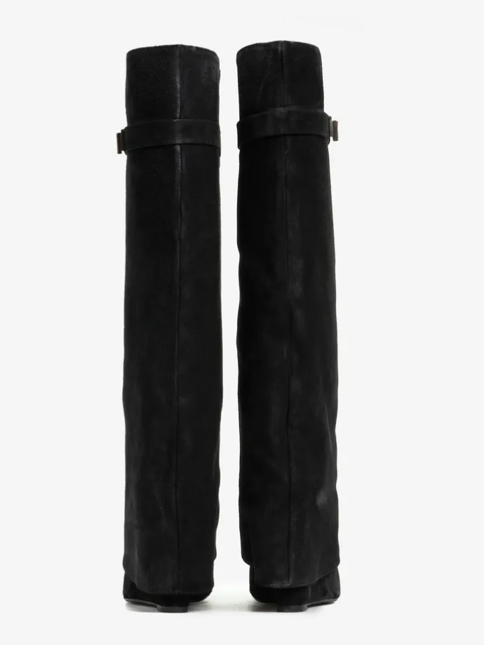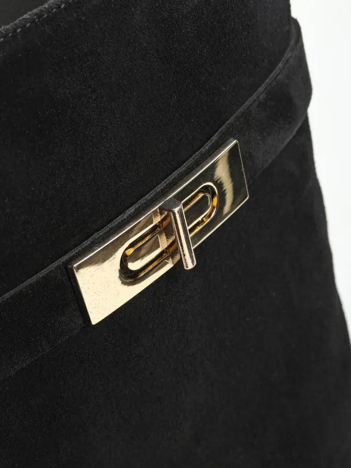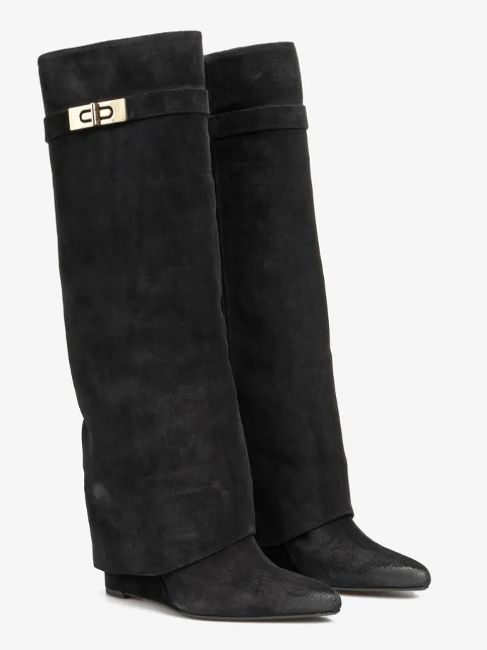 Zamszowe kozaki na koturnie z noskami w szpic. Przedłużona cholewka i ozdobny pasek ze złotą sprzączką.