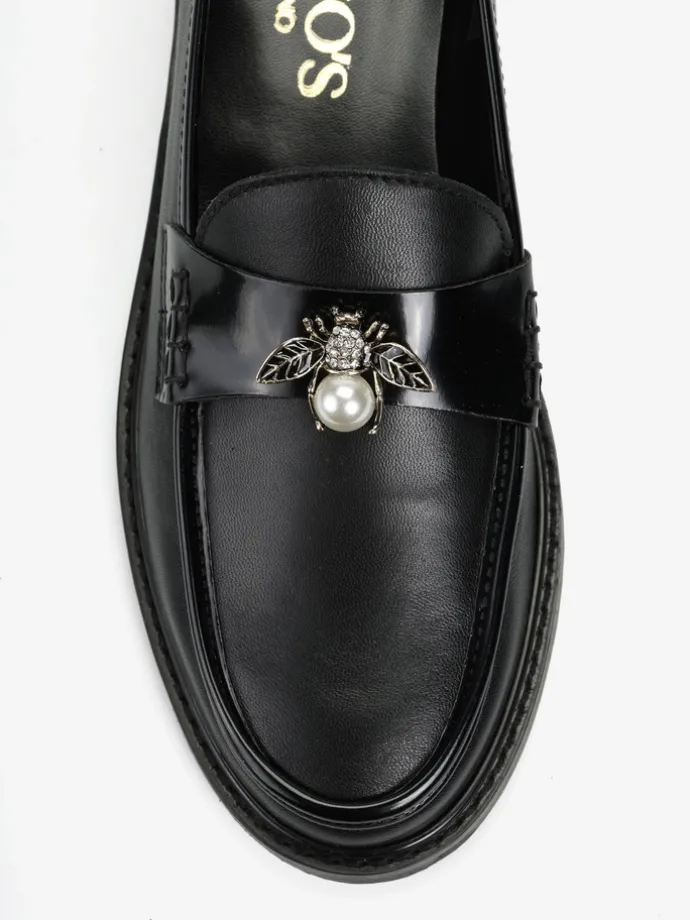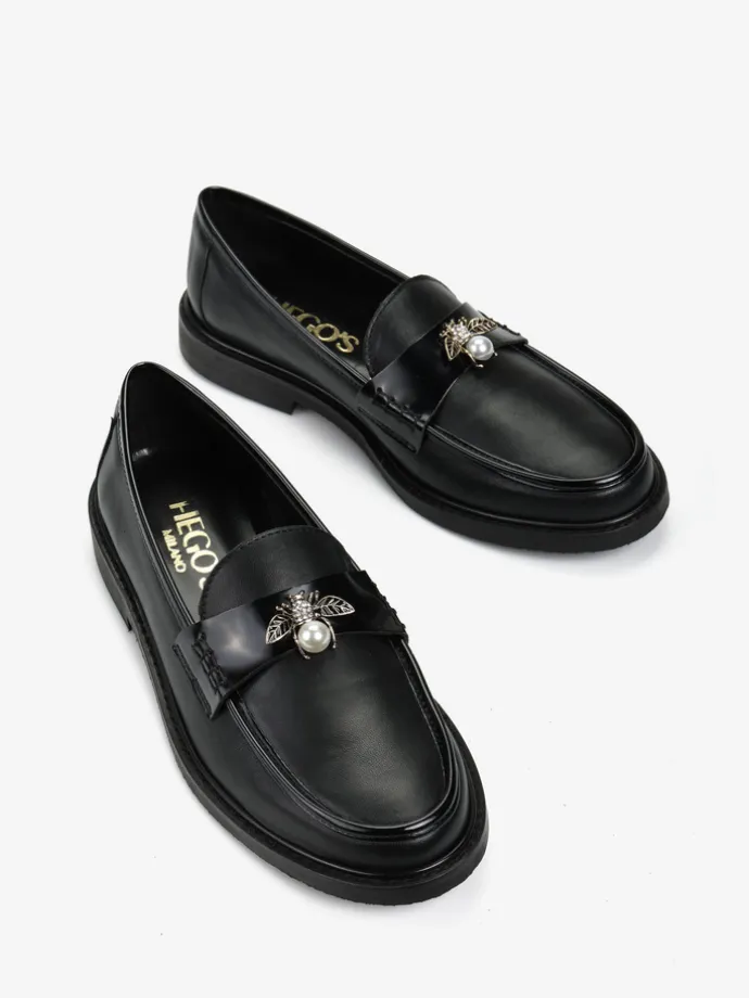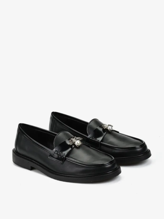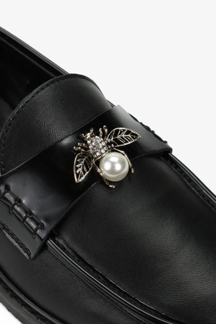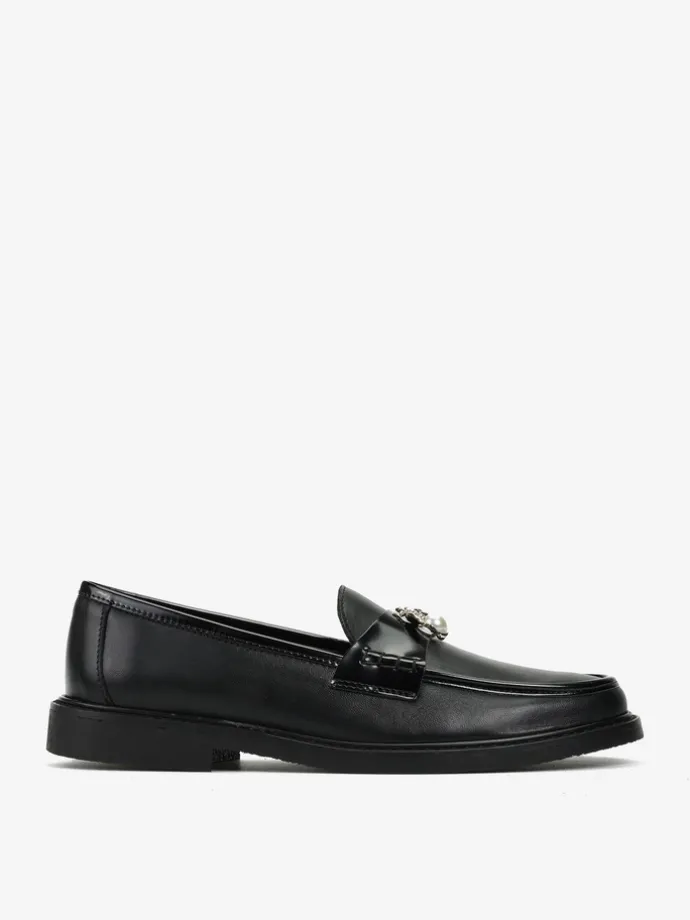 Czarne mokasyny wykonane z miękkiej, delikatnej skóry. Połyskująca patka z biżuteryjną aplikacją.