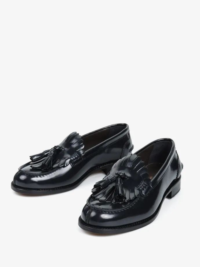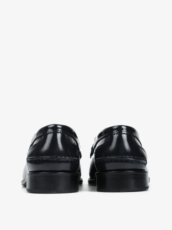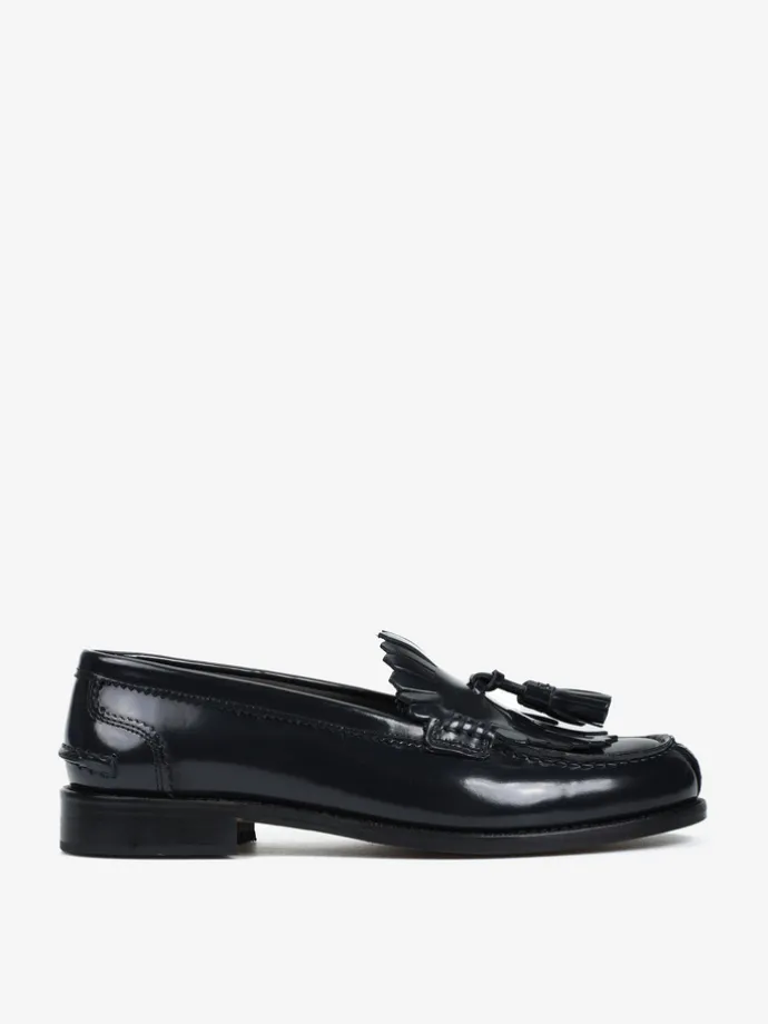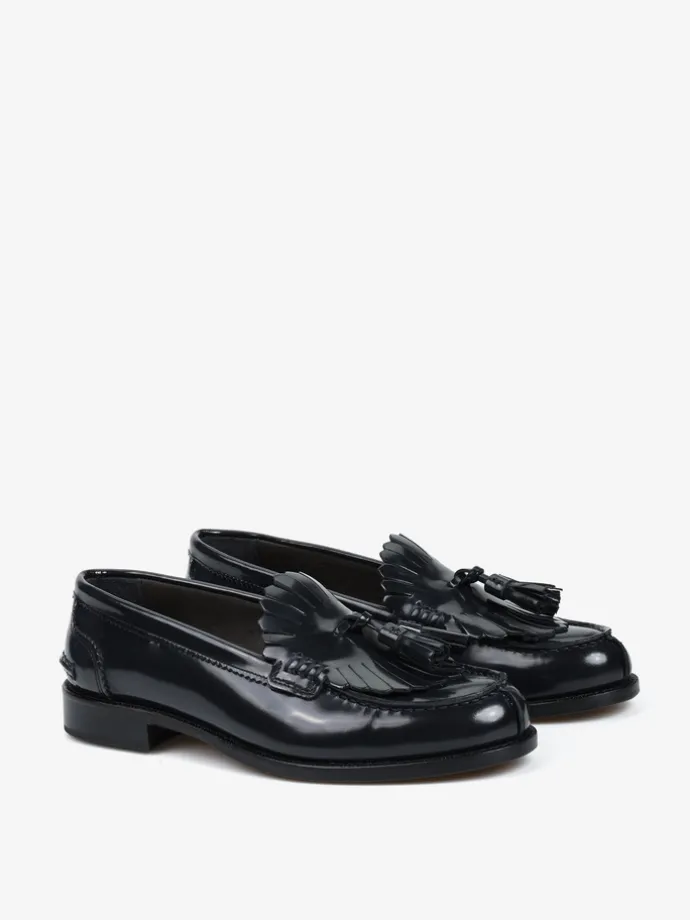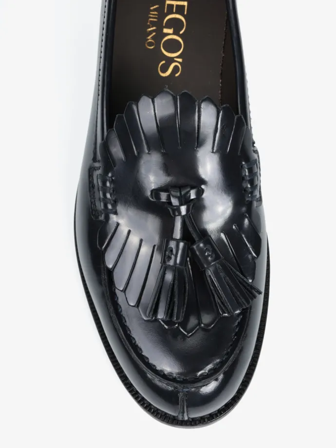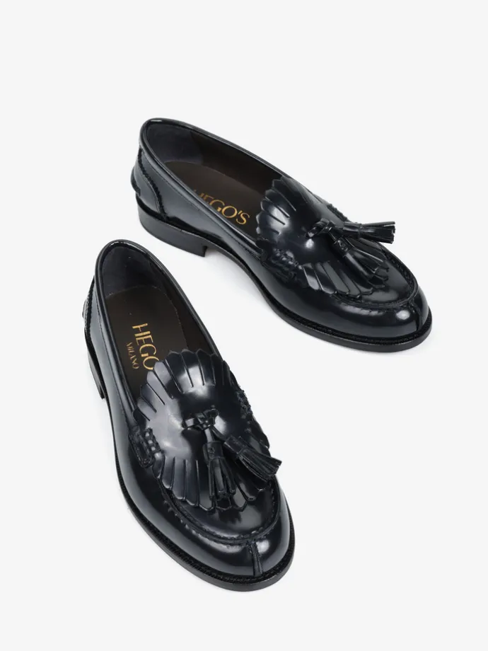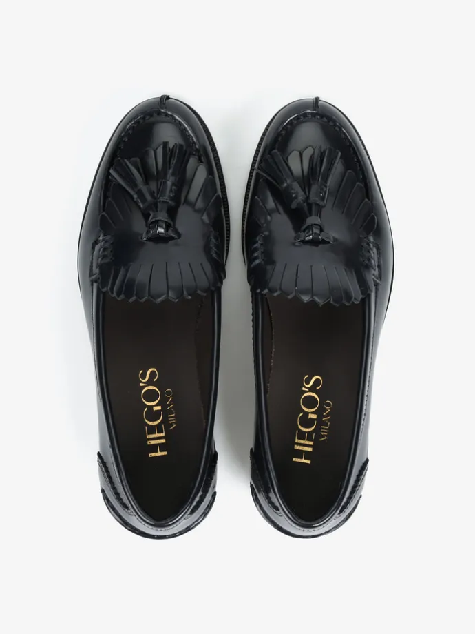 Czarne mokasyny wykonane ze skóry wysoko polerowanej, z wycięciami na języku i ozdobnymi frędzlami.