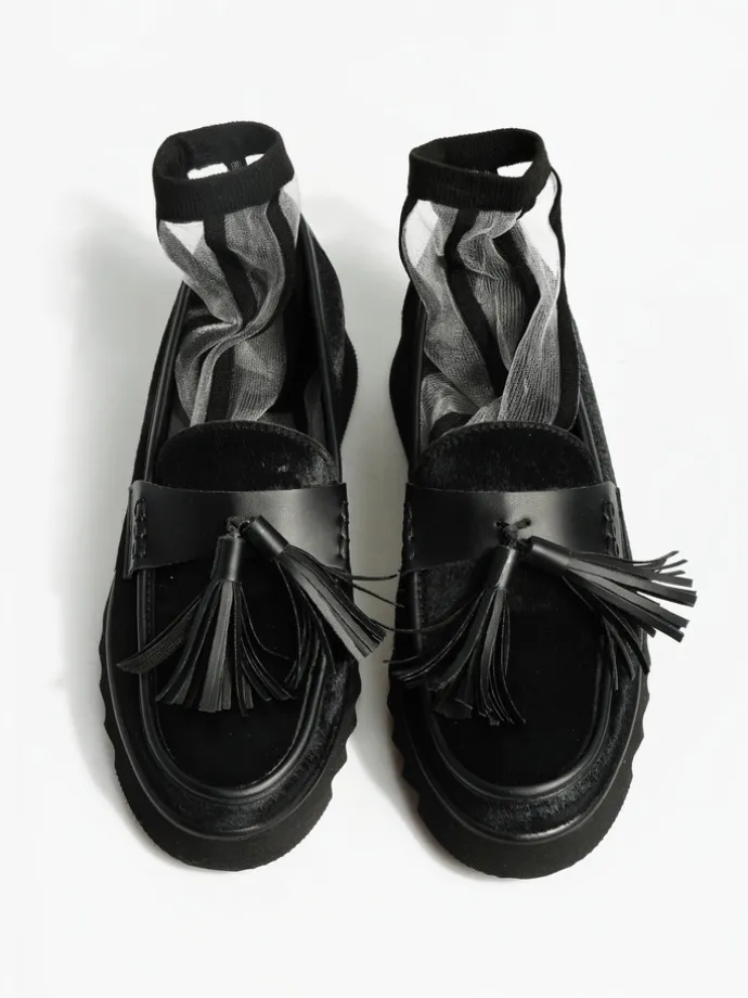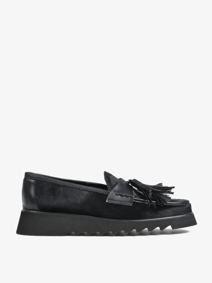 Czarne mokasyny na efektownej podeszwie wykonane z naturalnej skóry z włosiem. Ozdobna patka z frędzlami.