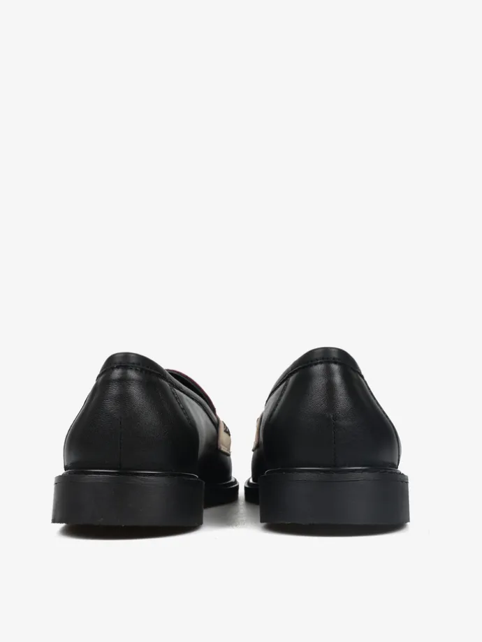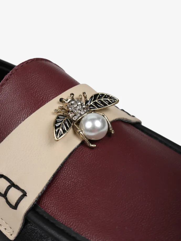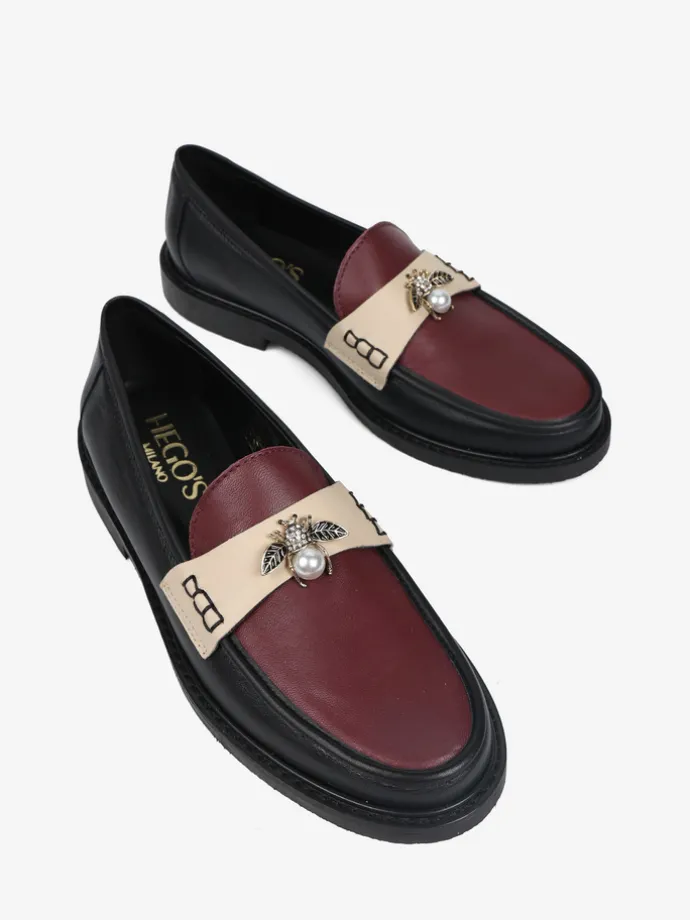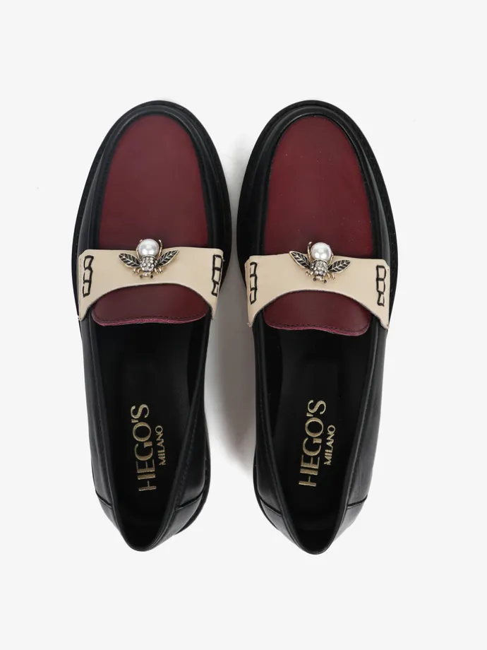 Mokasyny z kontrastującym, bordowym językiem wykonane z miękkiej i delikatnej skóry. Beżowa patka z biżuteryjną aplikacją.
