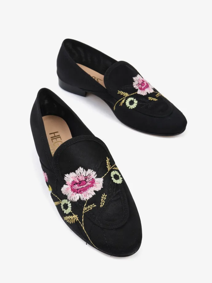 Mokasyny z przewiewnej siateczki z ozdobnym haftem w kwiaty.