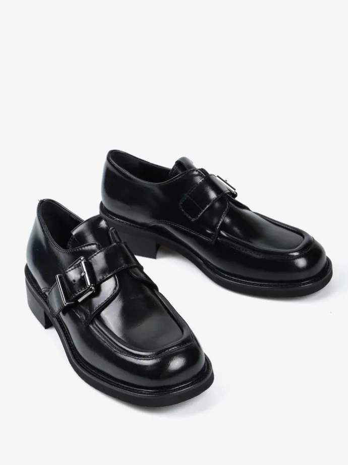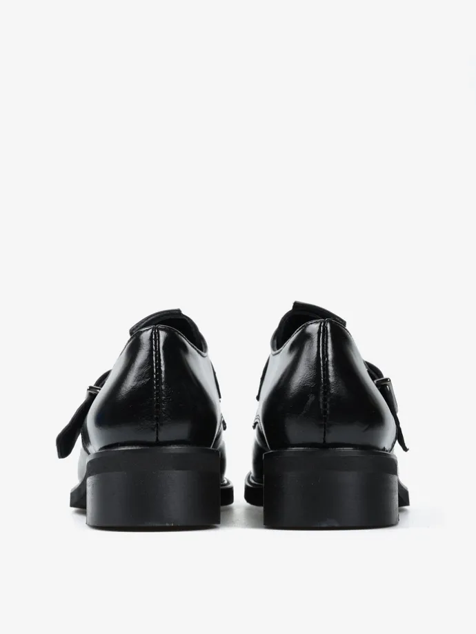 Czarne półbuty na niskim obcasie wykonane ze skóry wysoko polerowanej. Kwadratowe noski i regulowane zapięcie.