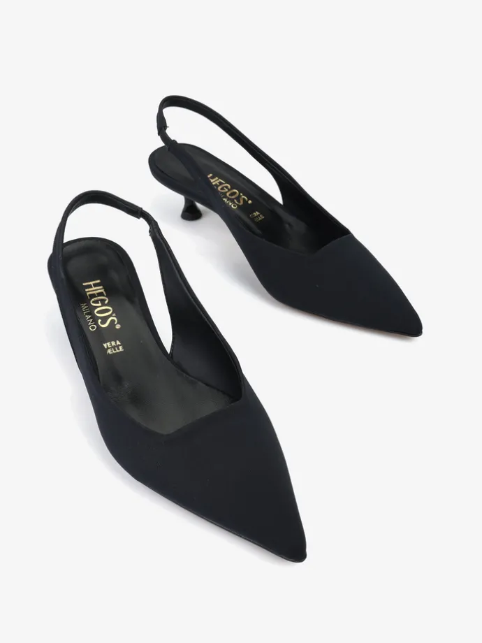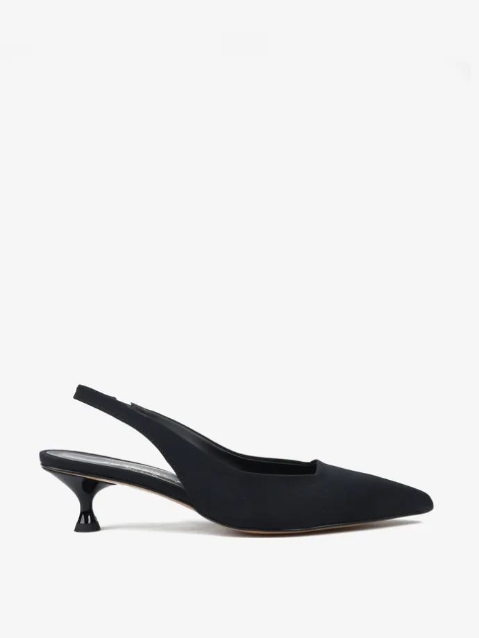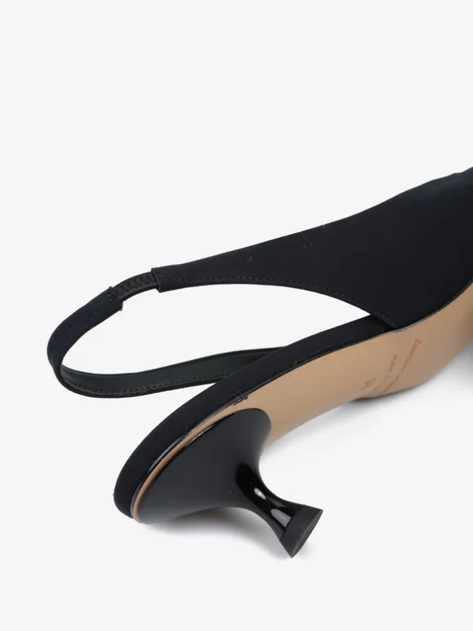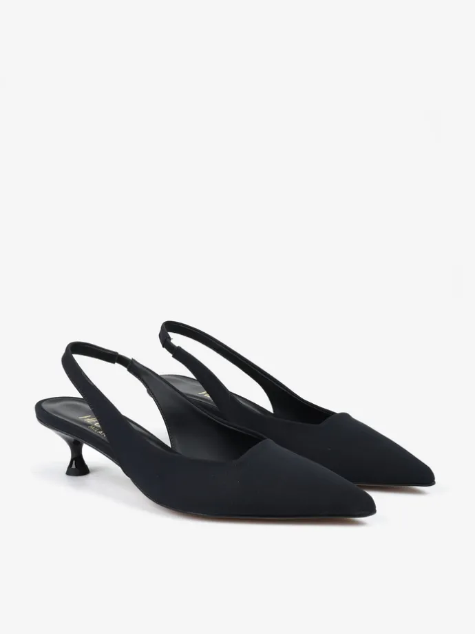 Szpilki z noskiem w szpic, wykonane z tkaniny. Odkryta pięta z paskiem dopasowującym się do stopy.