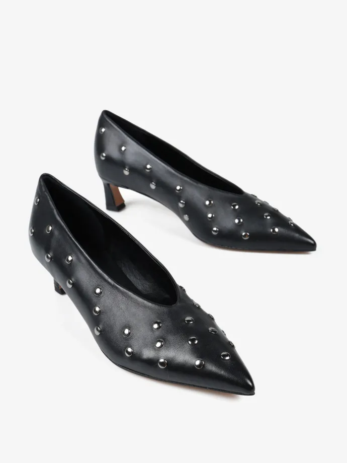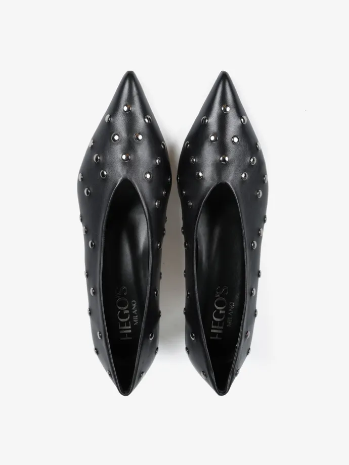 Niskie szpilki z zabudowanymi brzegami, noskiem w szpic i ozdobnymi ćwiekami.