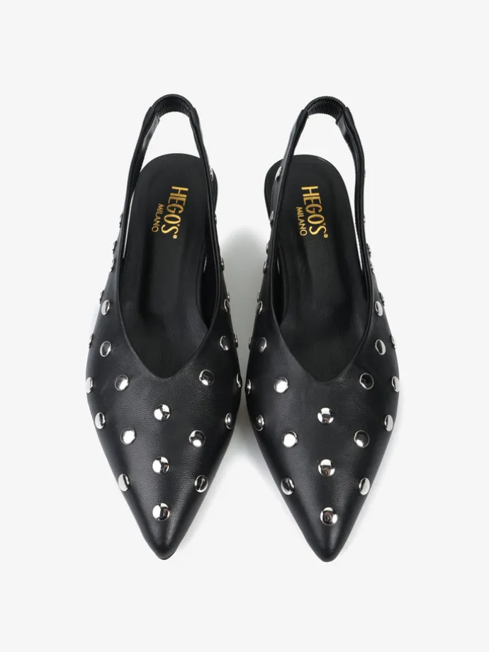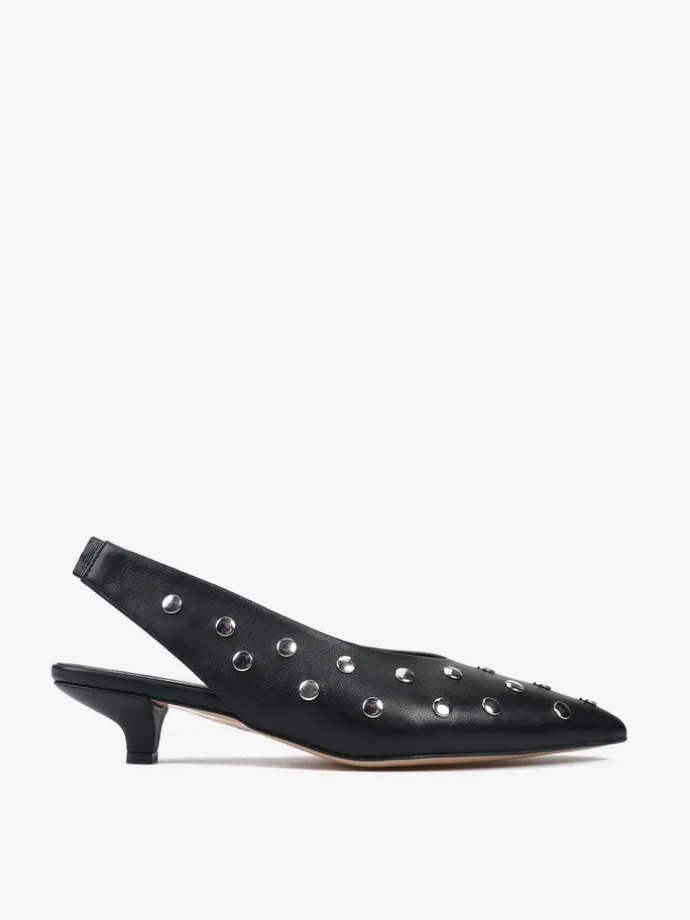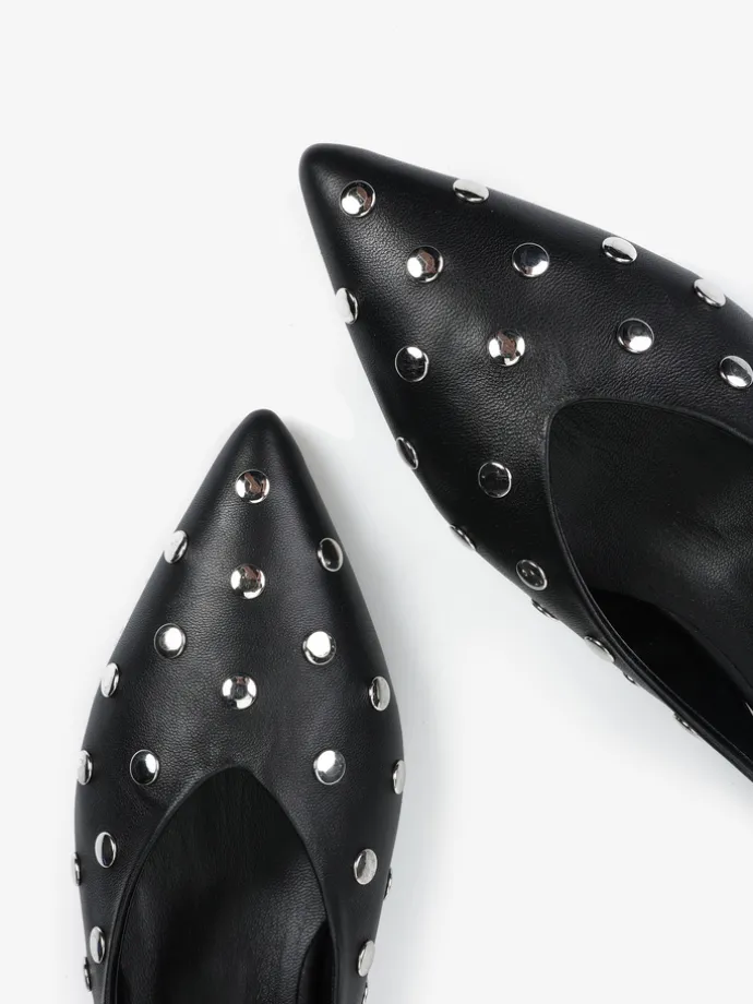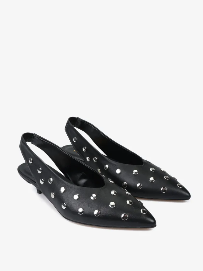 Szpilki z noskiem w szpic ze srebrnymi ćwiekami. Odkryta pięta z paskiem dopasowującym się do stopy.
