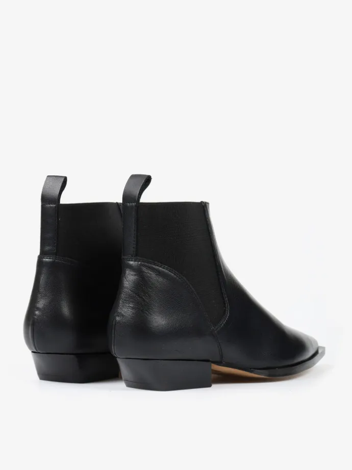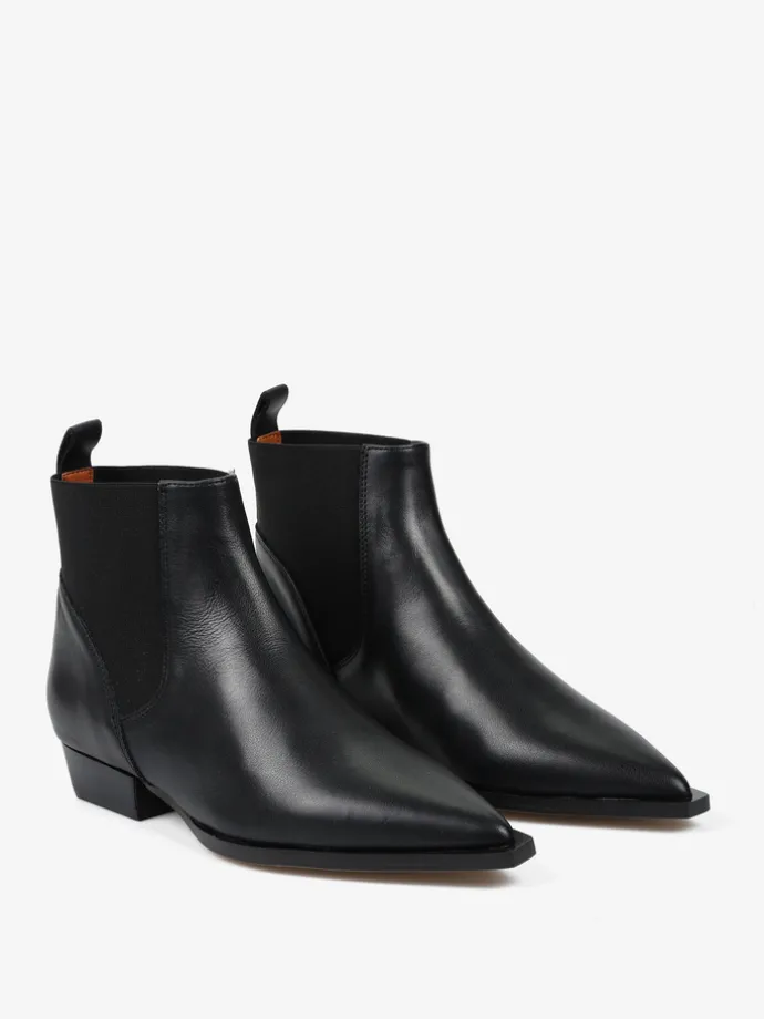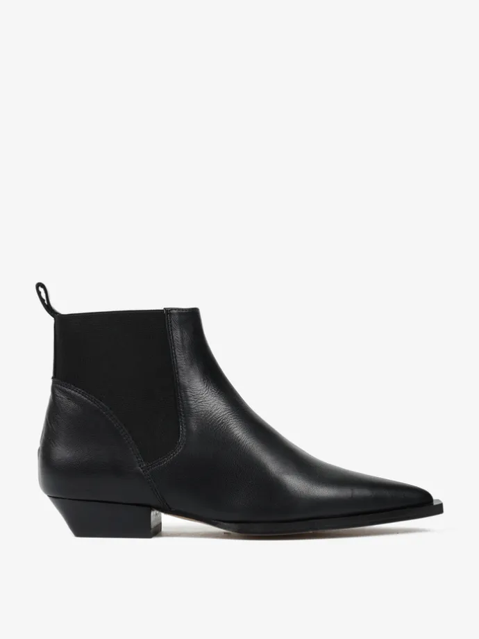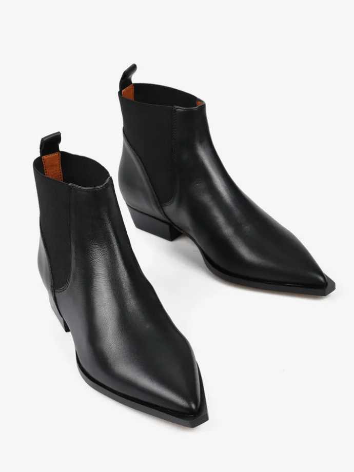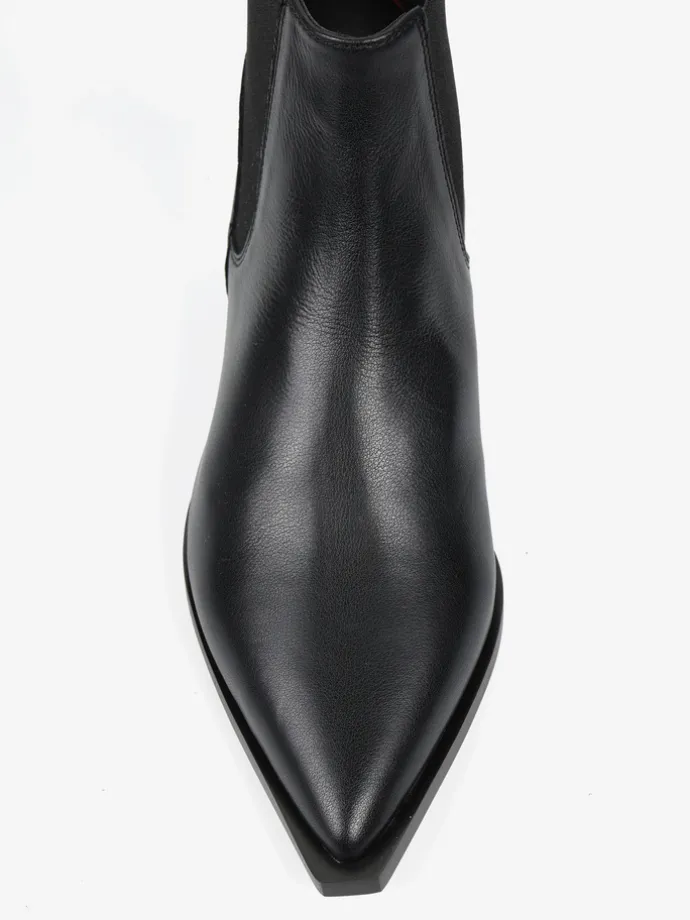 Czarne sztyblety w stylu kowbojskim. Noski w szpic i niski obcas.