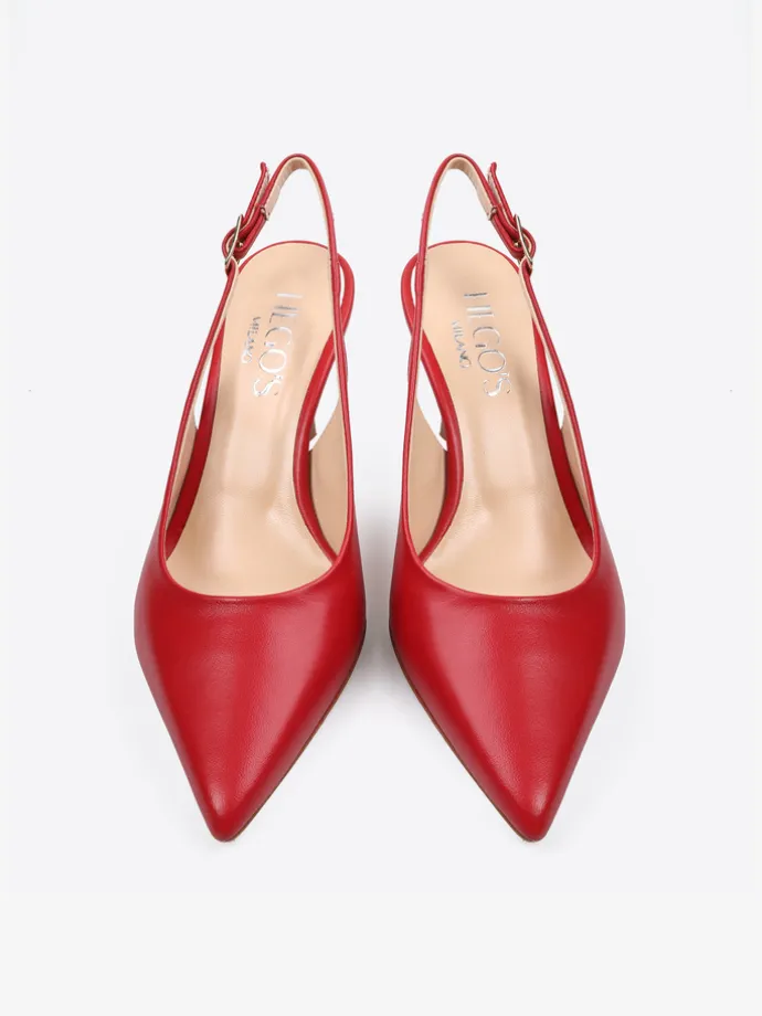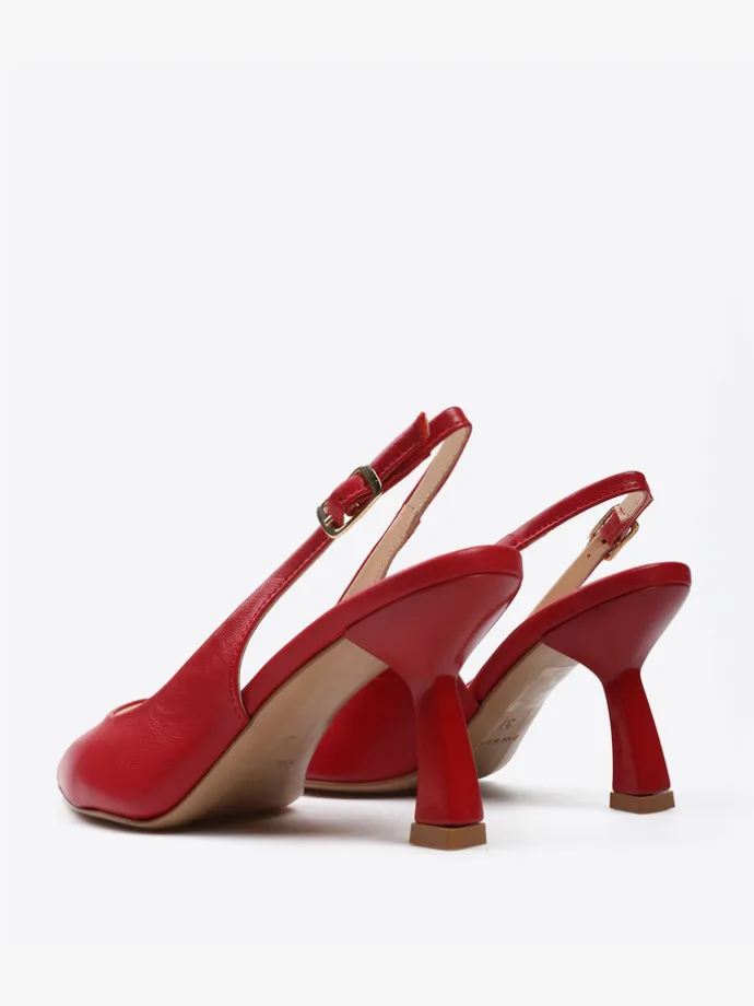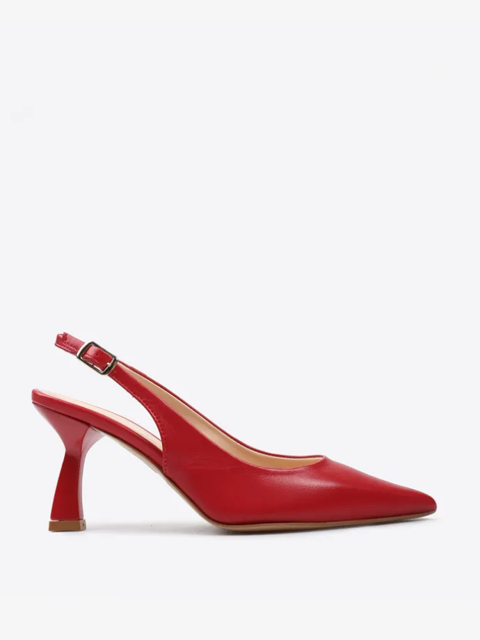 Klasyczne szpilki z noskiem w szpic wykonane z miękkiej, delikatnej skóry. Odkryta pięta z regulowanym paskiem.