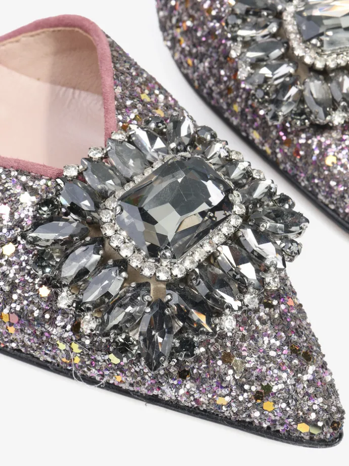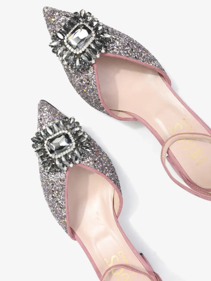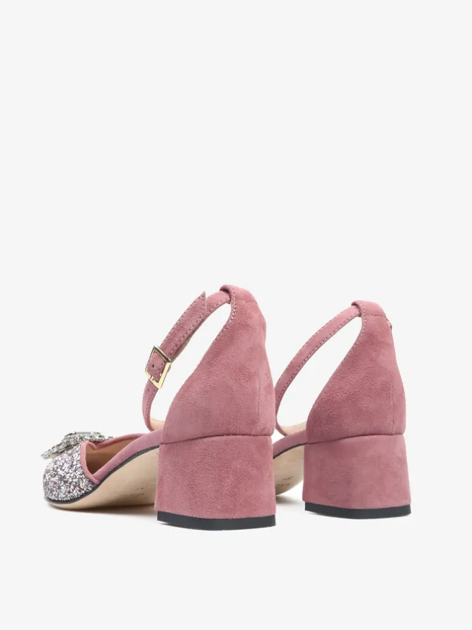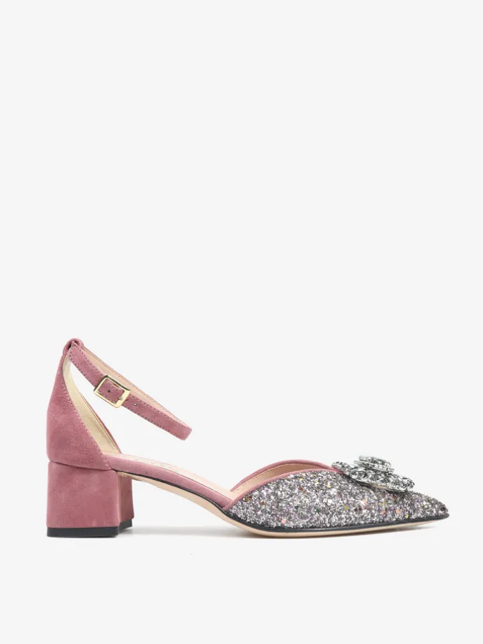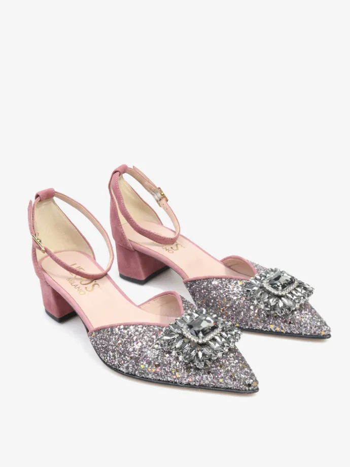 Czółenka na słupku z zakrytą pięta i regulowanym zapięciem. Nosek w szpic z biżuteryjną aplikacją, wykończony gruboziarnistym brokatem.