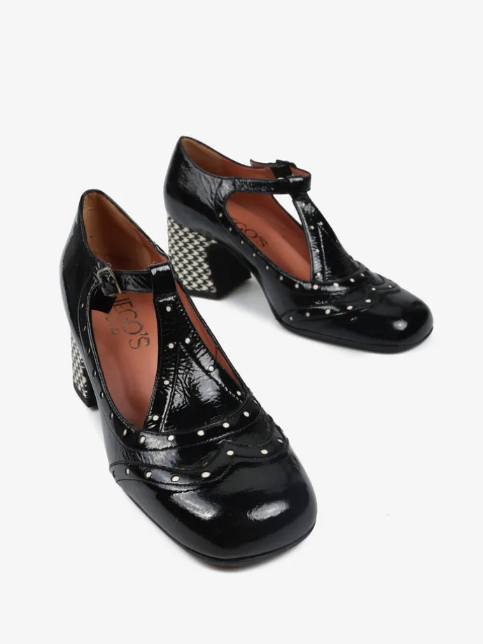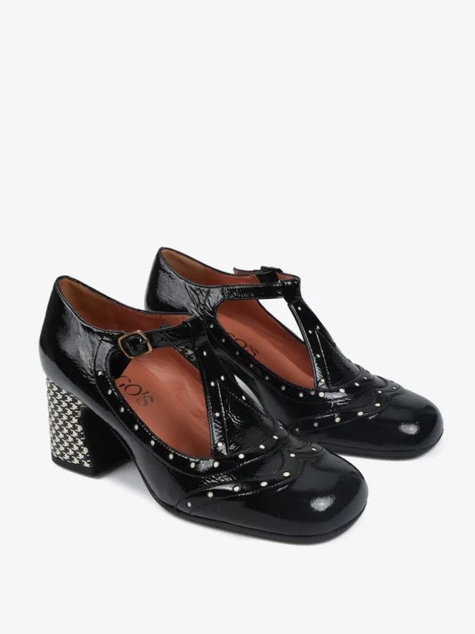 Lakierowane czółenka na wzorzystym słupku. Kwadratowe noski, szeroki pasek na podbiciu i regulowane zapięcie.