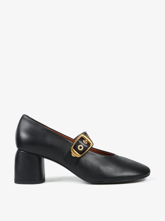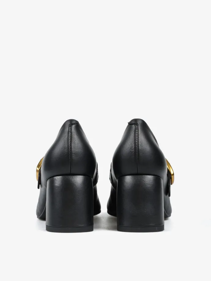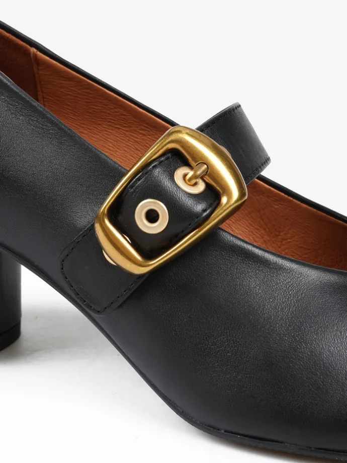 Czółenka Mary Jane na słupku. Owalne wycięcie i regulowany pasek.