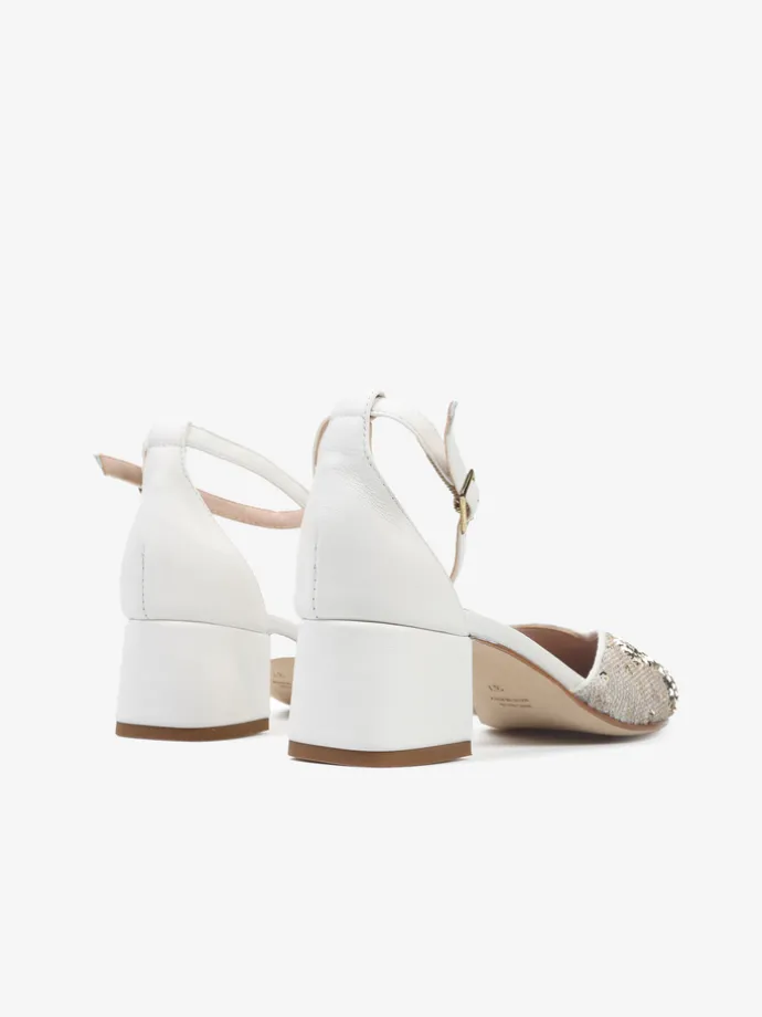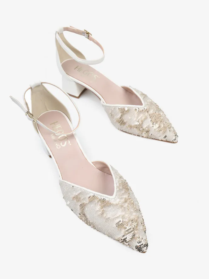 Czółenka na słupku z głębokim wycięciem i regulowanym zapięciem na kostce. Nosek w szpic wykończony dwustronnymi cekinami, które można układać.