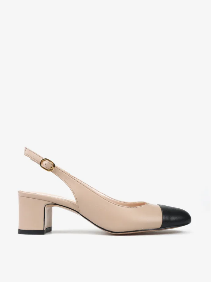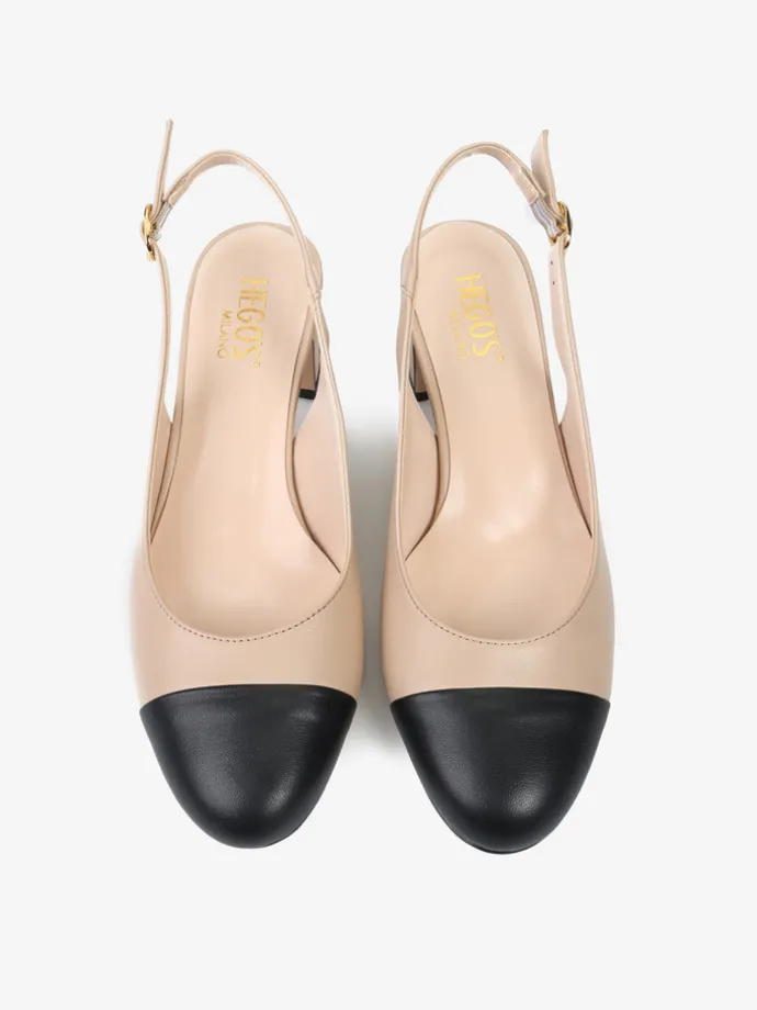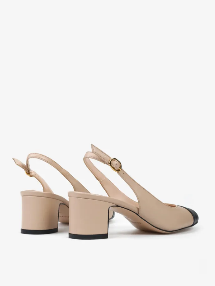 Klasyczne beżowe czółenka z okrągłym, czarnym noskiem. Odkryta pięta z regulowanym paskiem.