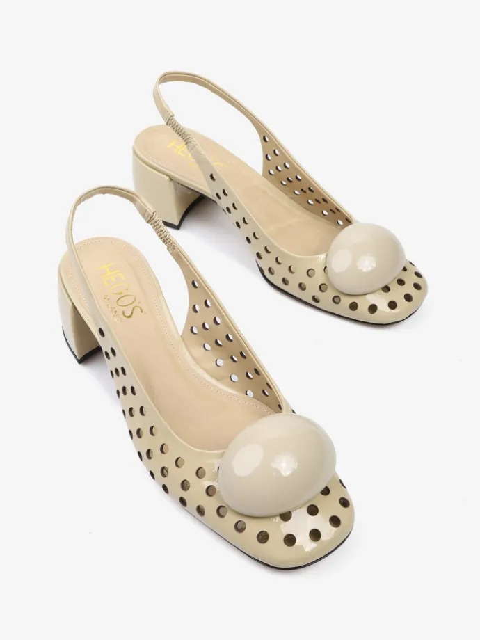 Ażurowe czółenka z ozdobną aplikacją. Odkryta pięta z paskiem dopasowującym się do stopy.