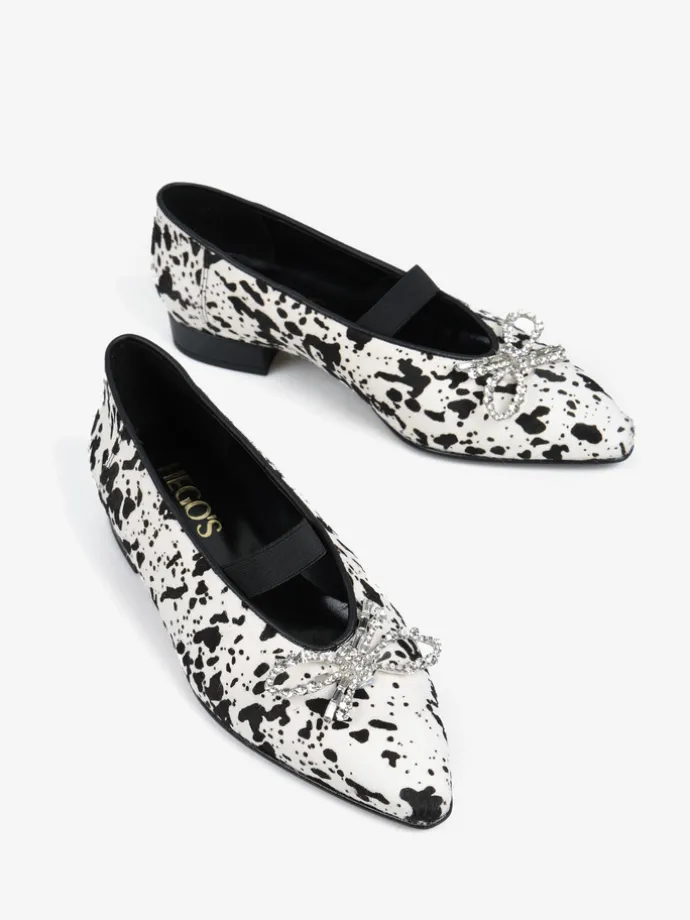 Baleriny z noskiem w szpic i gumką na podbiciu, wykonane z naturalnej skóry z włosiem. Wykończone ozdobną, biżuteryjną kokardą.