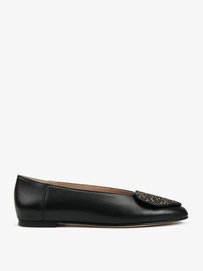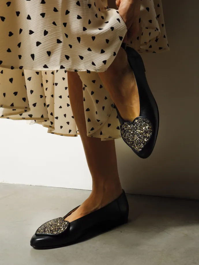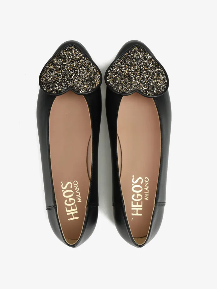 Proste baleriny z owalnym wycięciem i zabudowanymi brzegami na skórzanej podeszwie. Ozdobne serce z gruboziarnistym brokatem.
