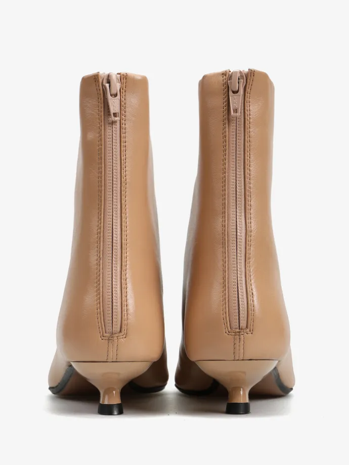 Skórzane botki na niskiej, profilowanej szpilce. Noski w szpic i zapięcie na suwak.