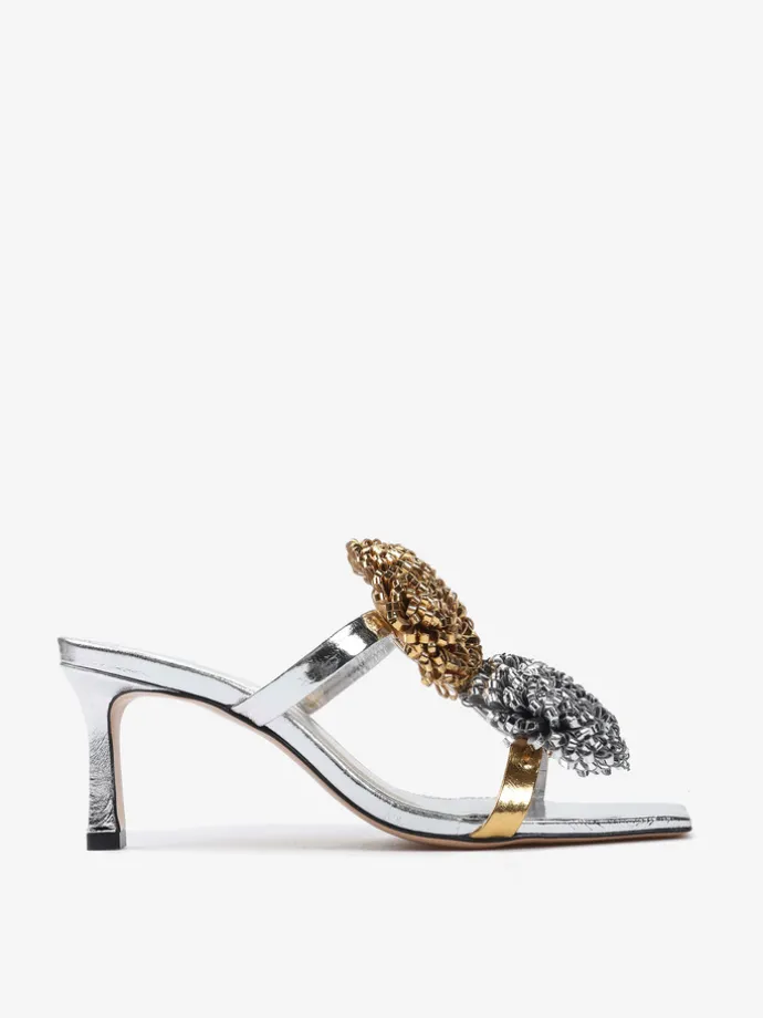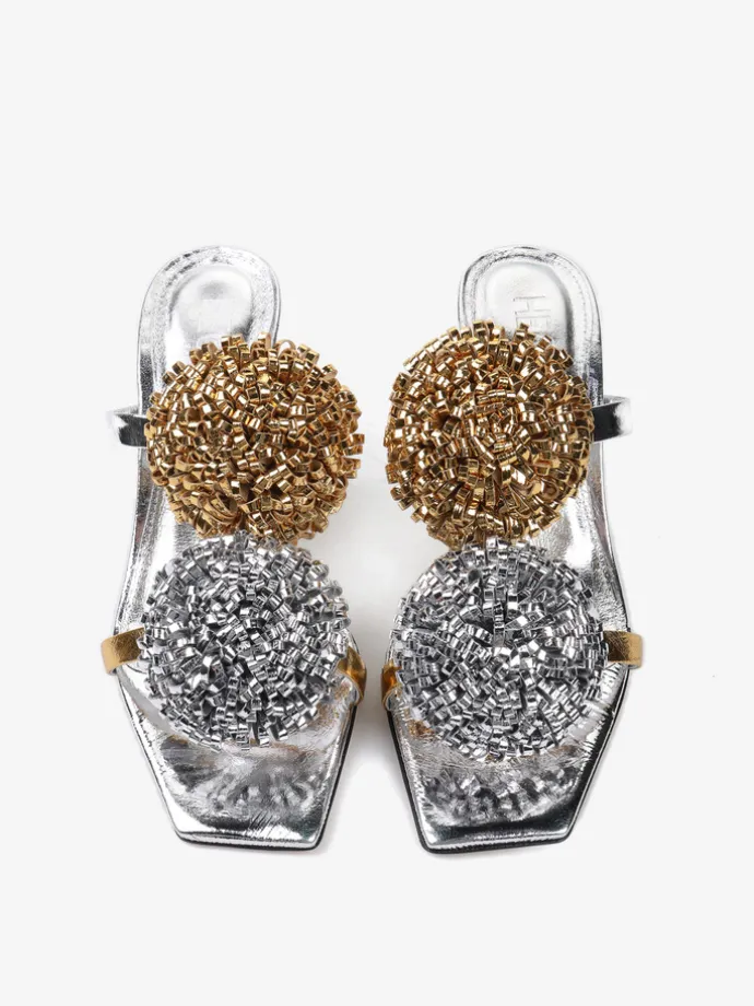 Klapki na szpilce wykonane z dwukolorowej metalizowanej skóry. Kwadratowy nosek i ozdobne pompony.
