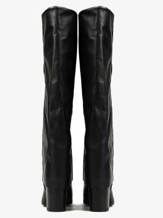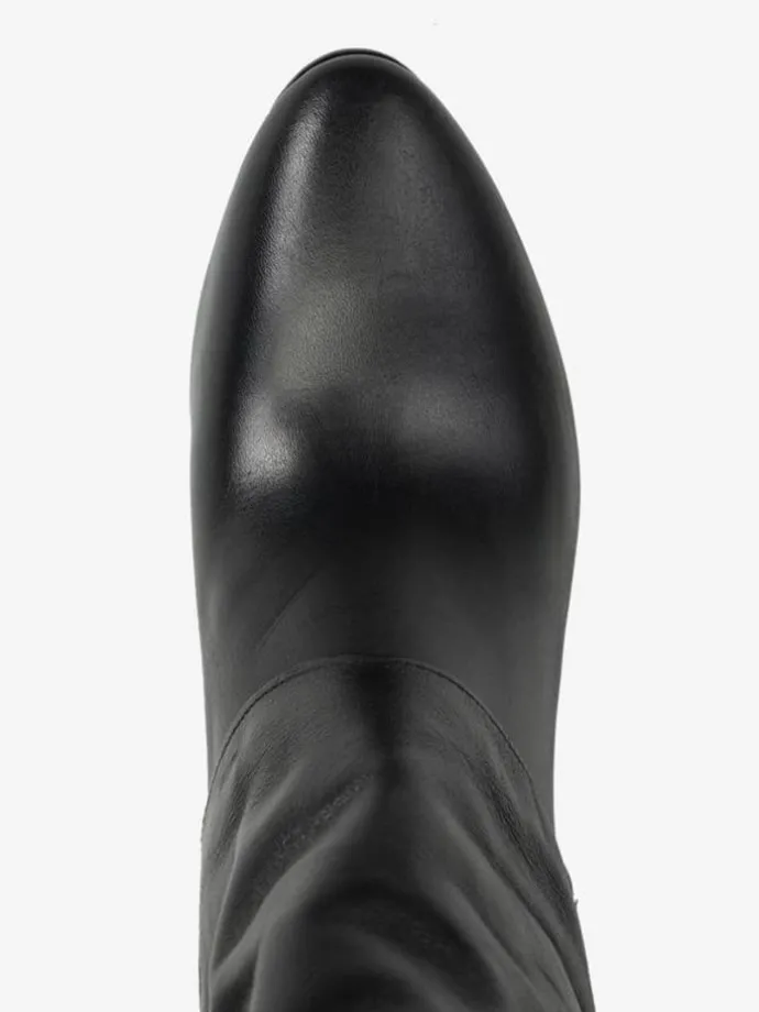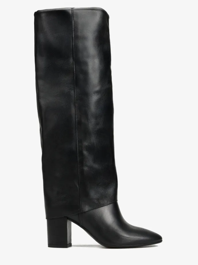 Skórzane, wsuwane kozaki na stabilnym słupku. Przedłużona cholewka.