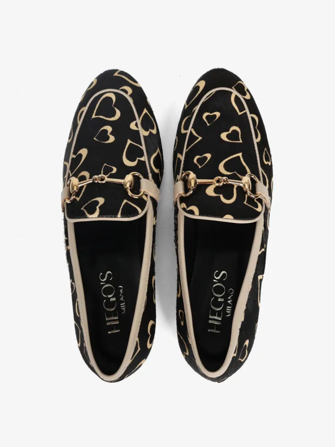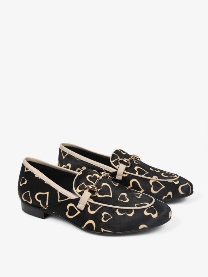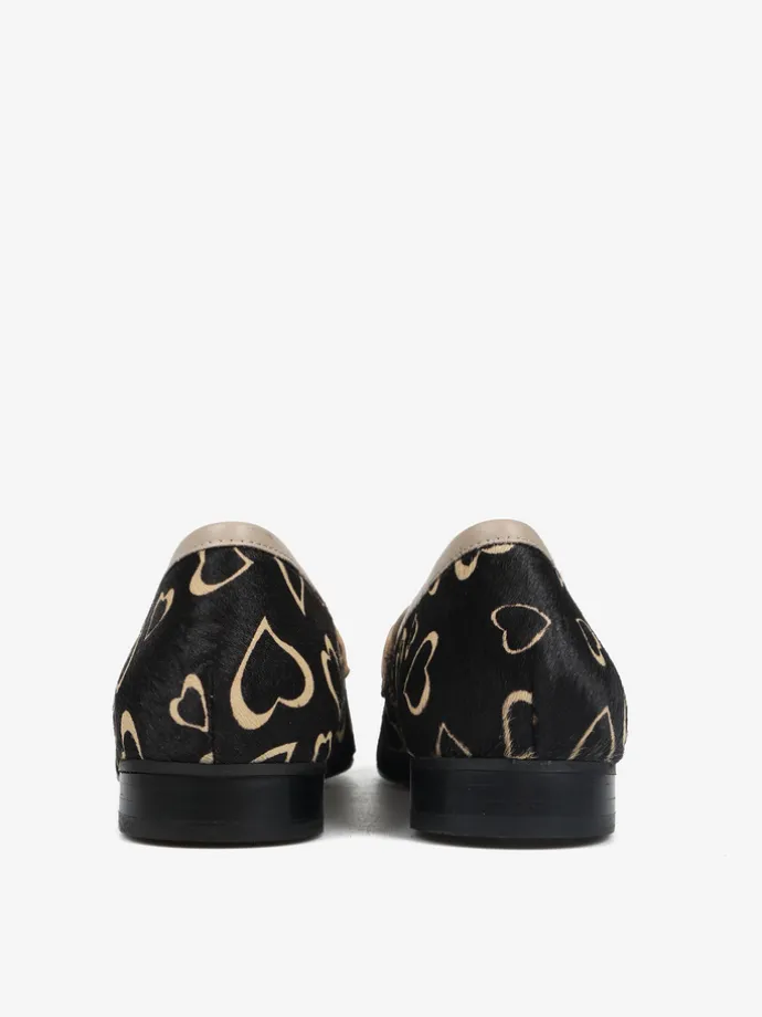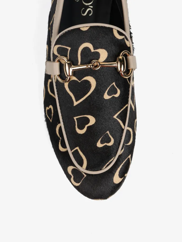 Mokasyny w serca wykonane ze skóry z włosiem. Beżowa lamówka i ozdobne, złote wędzidło.