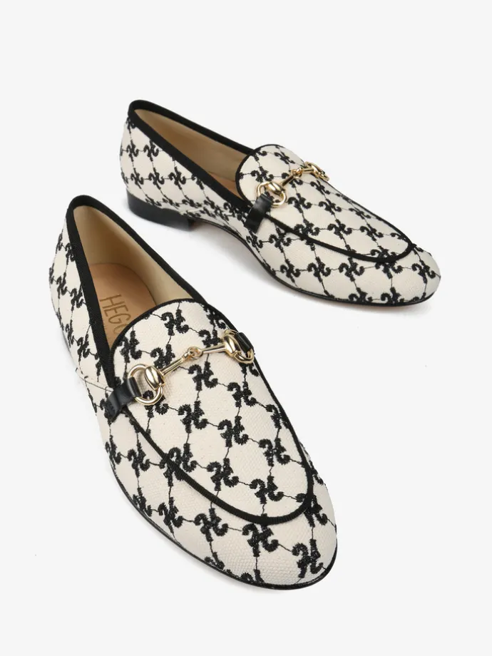 Mokasyny z haftowanym monogramem i metalowym wędzidłem.