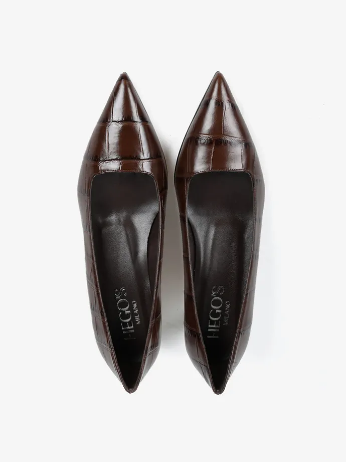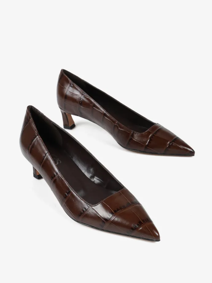 Niskie szpilki wykonane ze skóry w krokodyli wzór. Kwadratowe wycięcie i nosek w szpic.