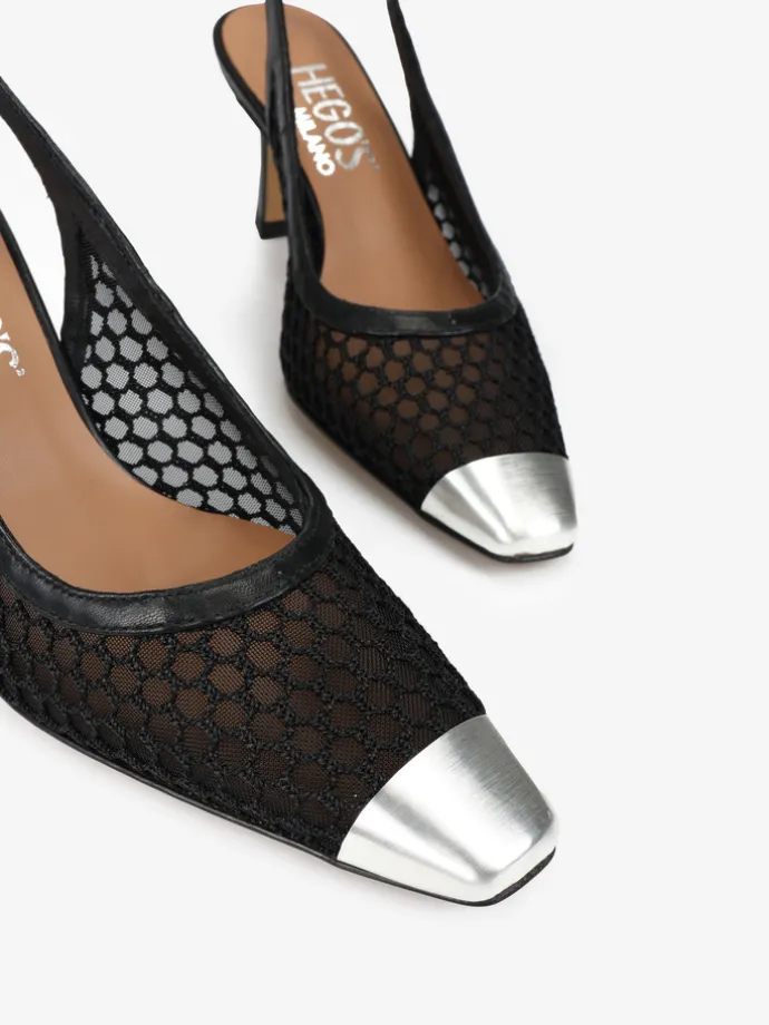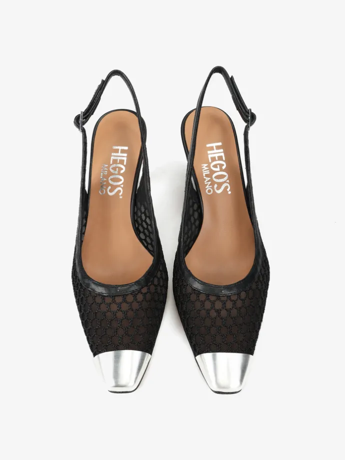 Eleganckie szpilki wykonane ze skóry i przewiewnej siateczki, z metalowym noskiem. Odkryta pięta z regulowanym paskiem.