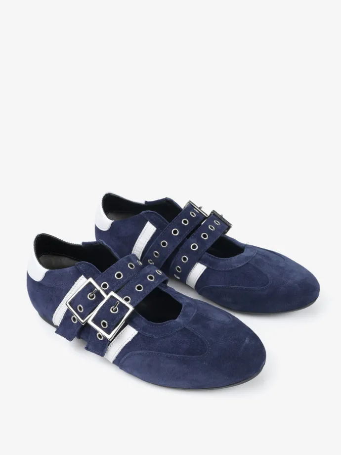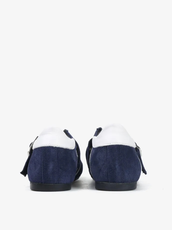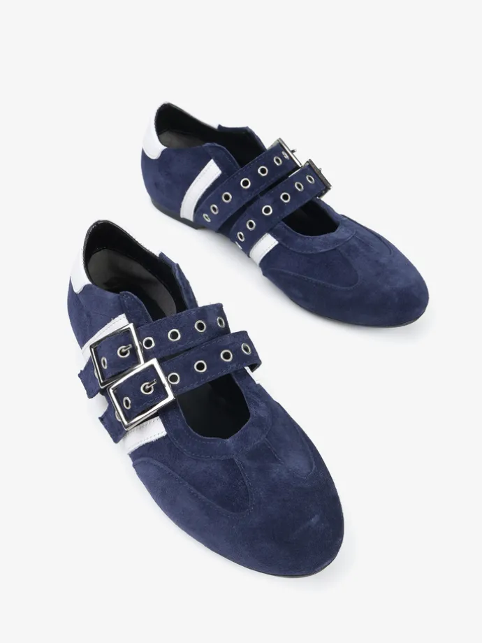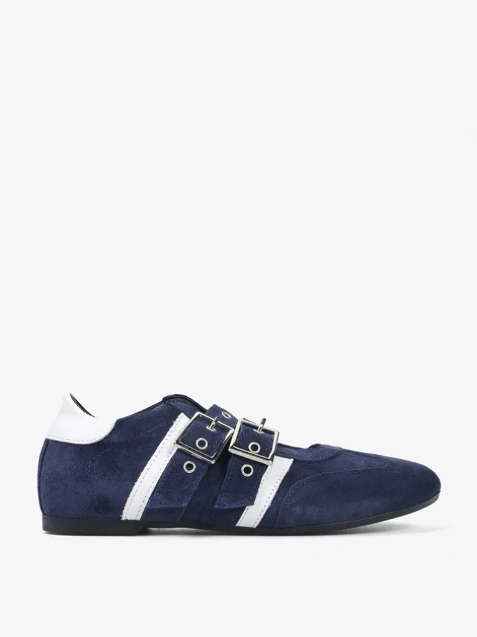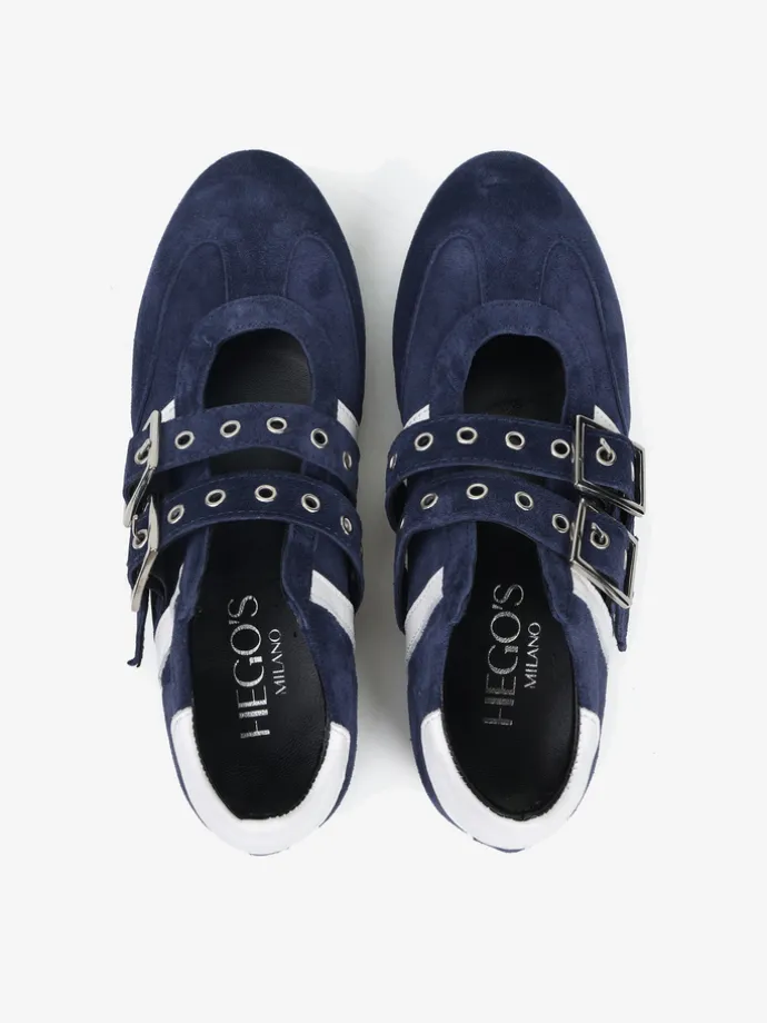 Zamszowe sneakersy z głębokim wycięciem i dwoma regulowanymi paskami. Białe przeszycia ze skóry licowej