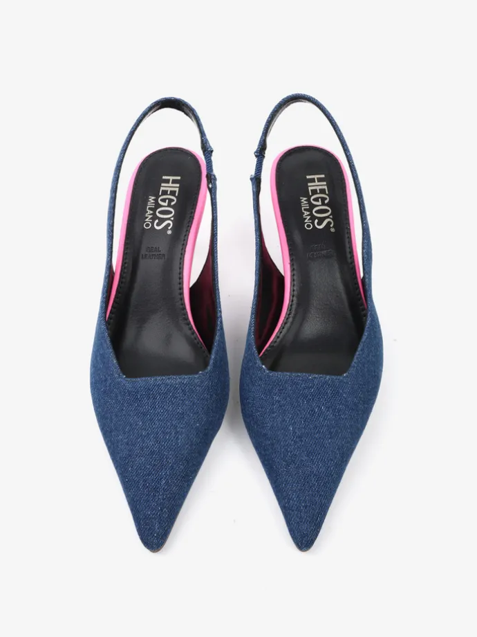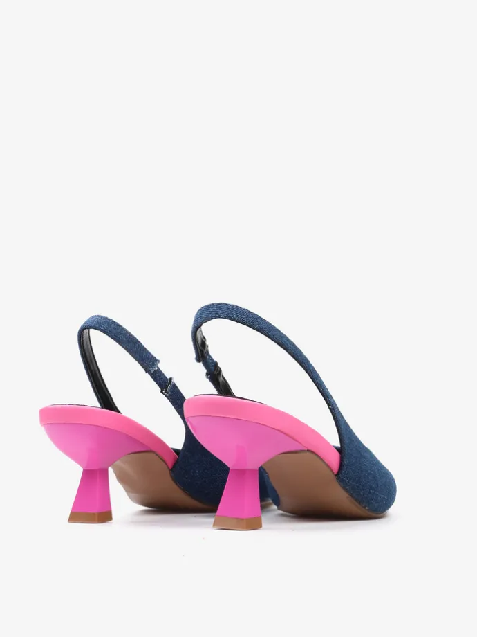 Jeansowe czółenka na neonowej szpilce. Nosek w szpic i odkryta pięta z paskiem dopasowującym się do stopy.