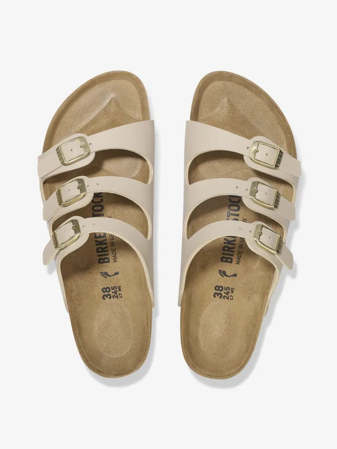 BIRKENSTOCK budzi klasyczny model Floryda do życia. Dzięki trzem wąskim, indywidualnie regulowanym paskom, sandał może być dopasowany do każdego kształtu stopy, a ponadto zapewnia jej również dobre trzymanie. Materiał wierzchni stanowi przyjazny dla skóry i wytrzymały materiał Birko-Flor®.