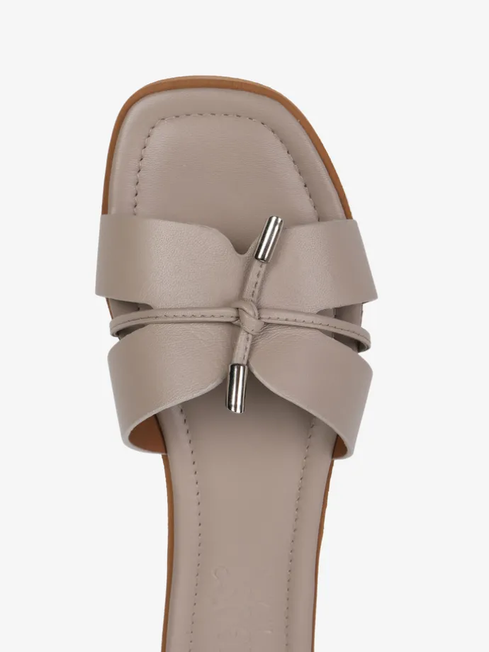 Modne klapki wykonane z miękkiej, delikatnej skóry. Ozdobne wiązanie ze skórzanego sznurka wykończonego metalowymi skuwkami.