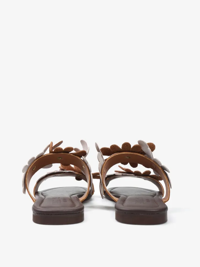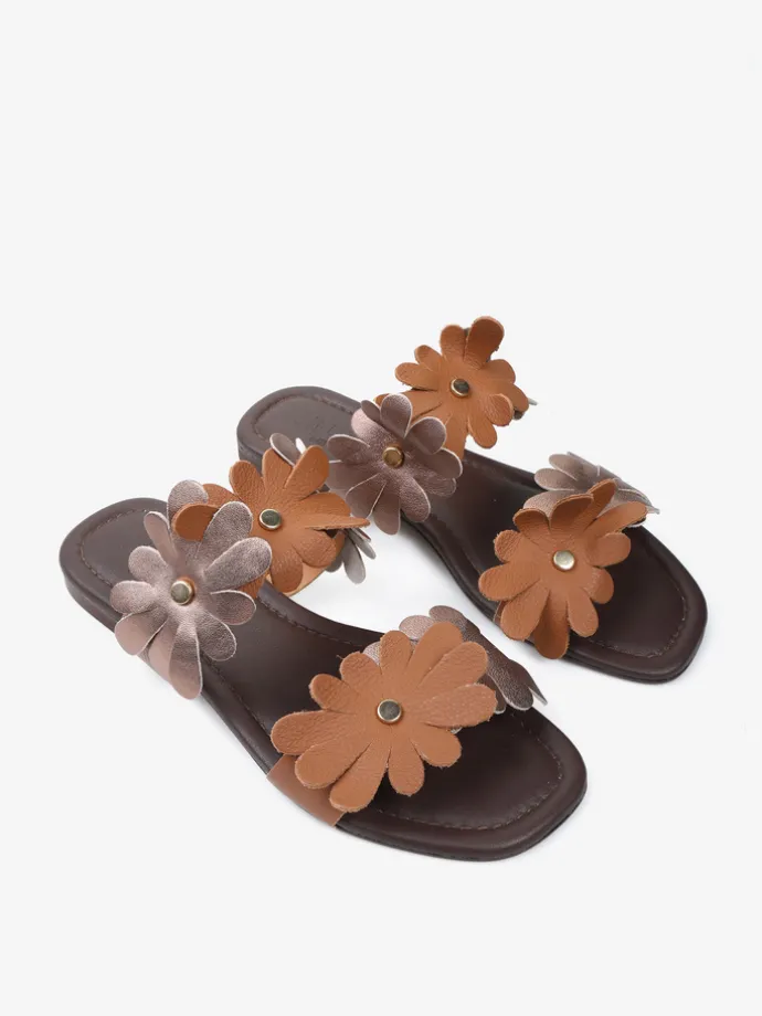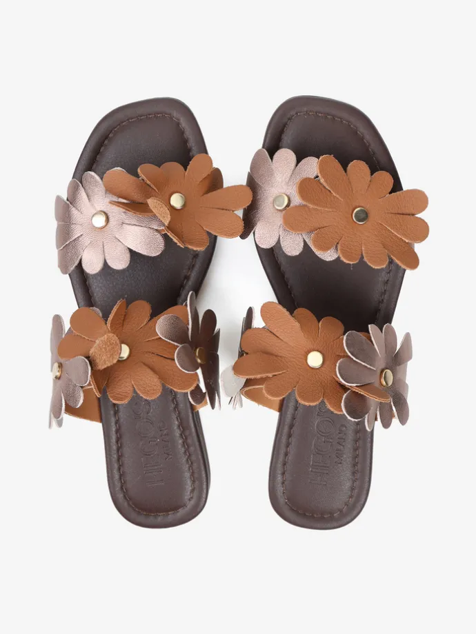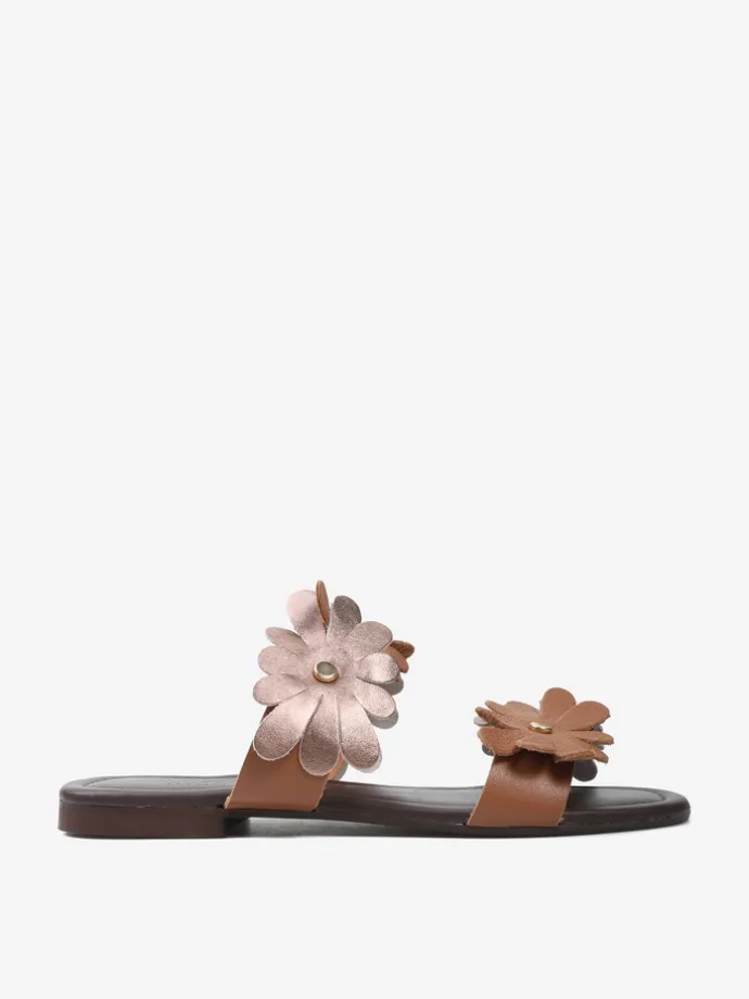 Skórzane klapki na płaskiej podeszwie wykonane z miękkiej, delikatnej skóry. Dwa paski z ozdobnymi kwiatami ze skóry naturalnej i metalizowanej.