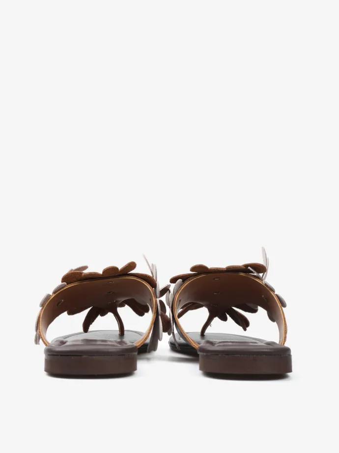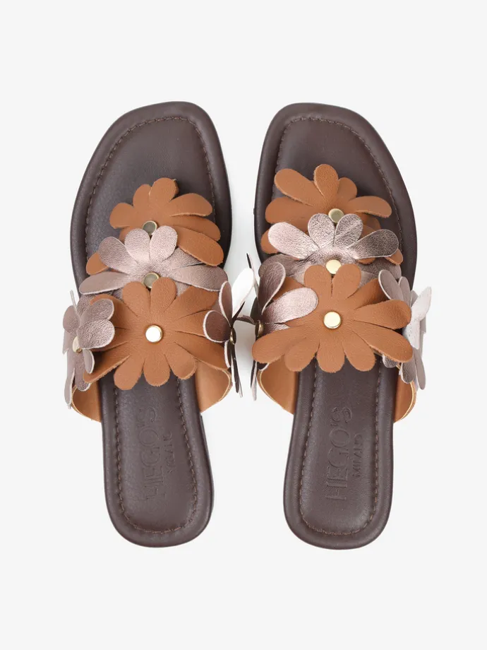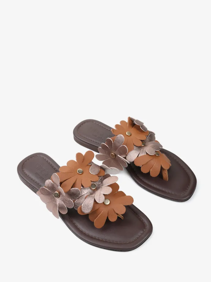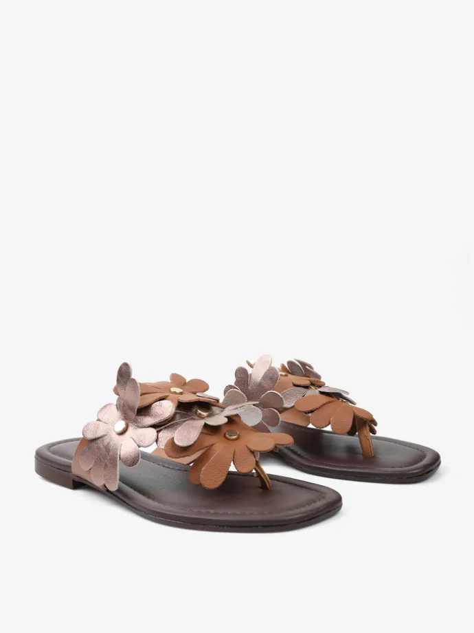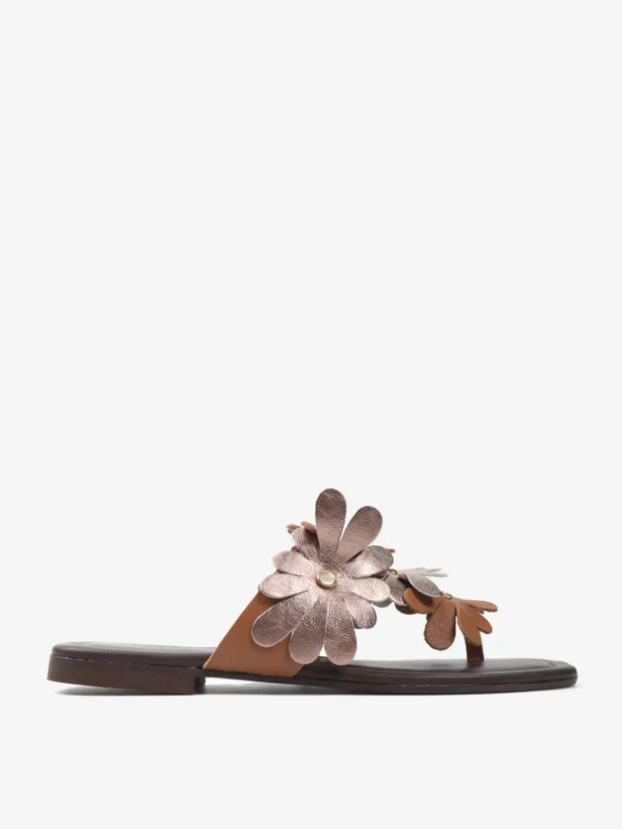Skórzane japonki na płaskiej podeszwie wykonane z miękkiej, delikatnej skóry. Ozdobne kwiaty ze skóry naturalnej i metalizowanej.