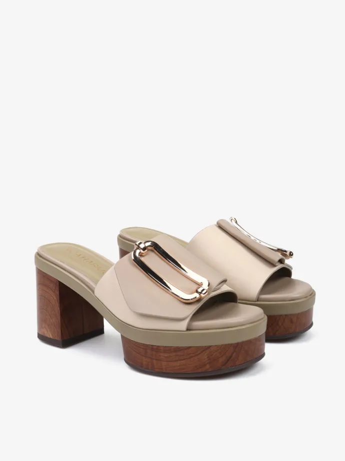 Klapki NOA HARMON z szerokim paskiem i ozdobną klamrą. Obcas i platforma z efektem drewna.