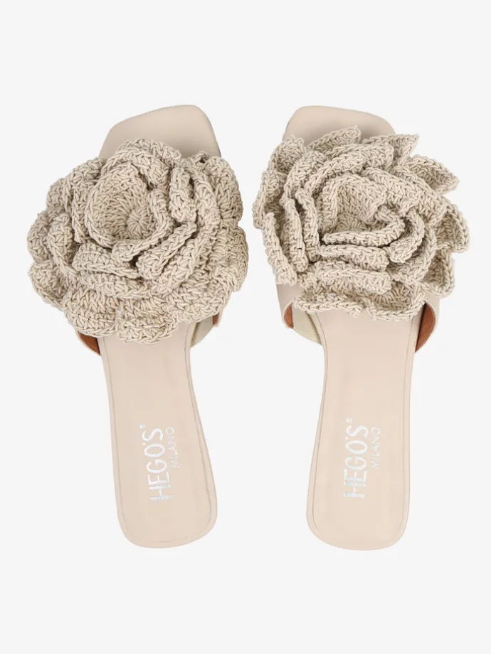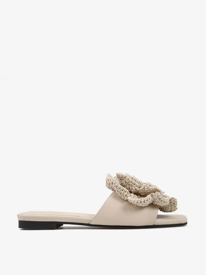 Skórzane klapki na płaskiej podeszwie z trójwymiarowym, szydełkowym kwiatem.