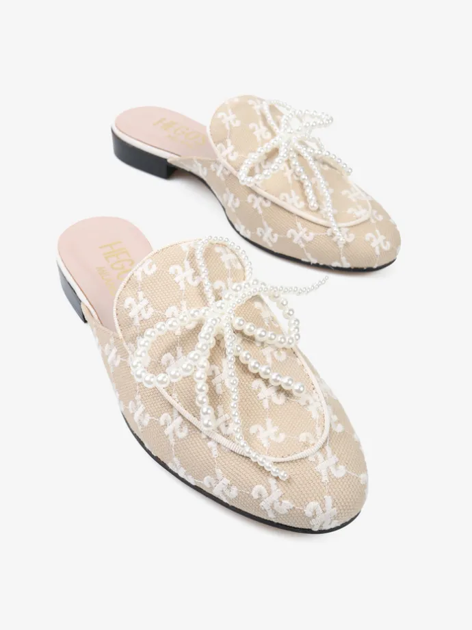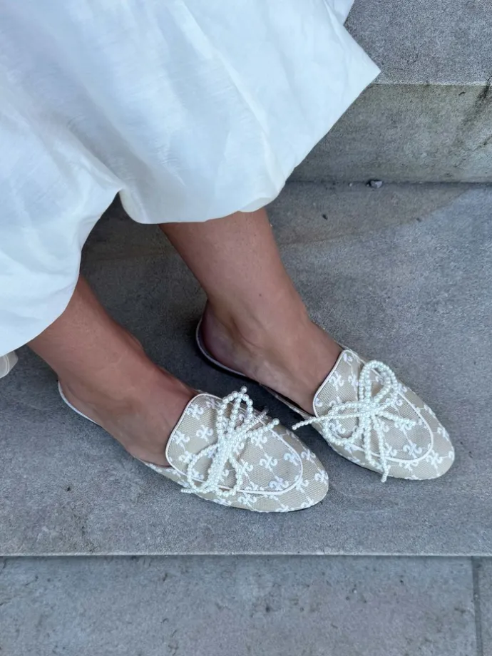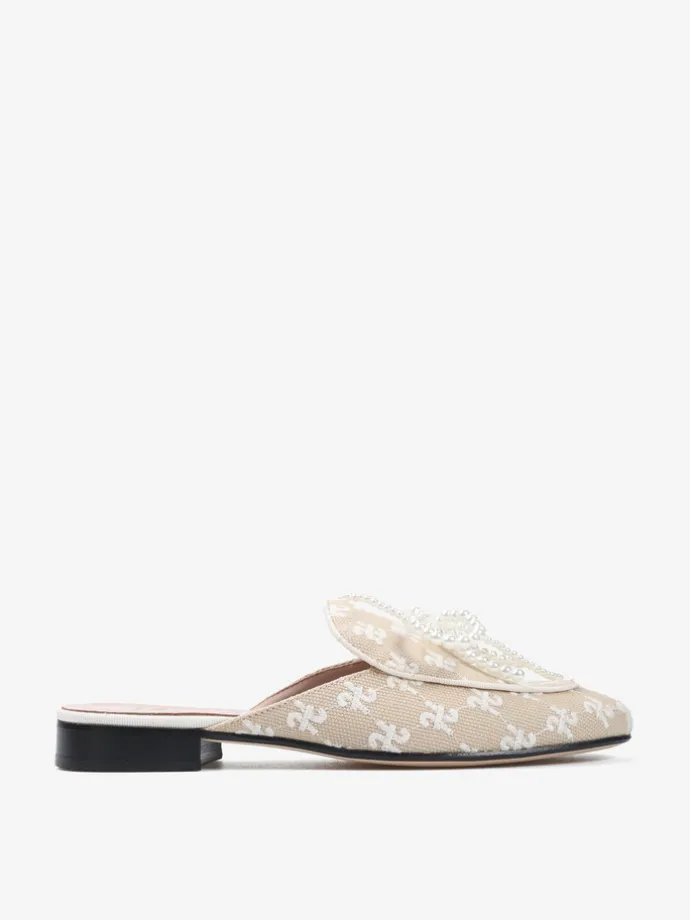 Materiałowe mule z haftowanym monogramem i kokardką z pereł.