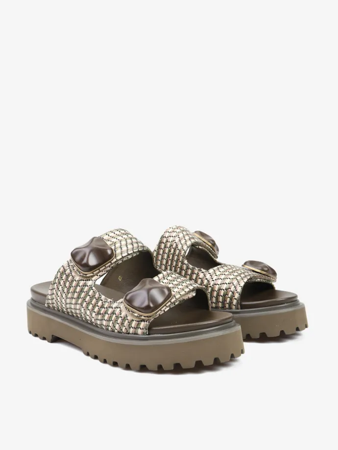 Klapki NOA HARMON z ozdobną aplikacją i plecionymi paskami zapinanymi na rzep. Podeszwa i wkładka w kolorze khaki.