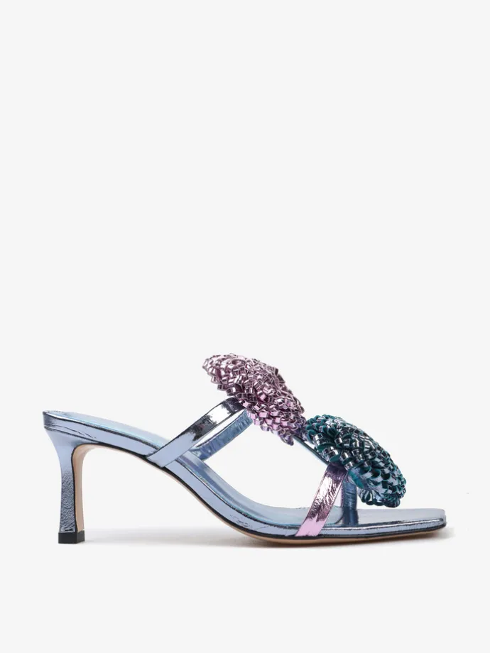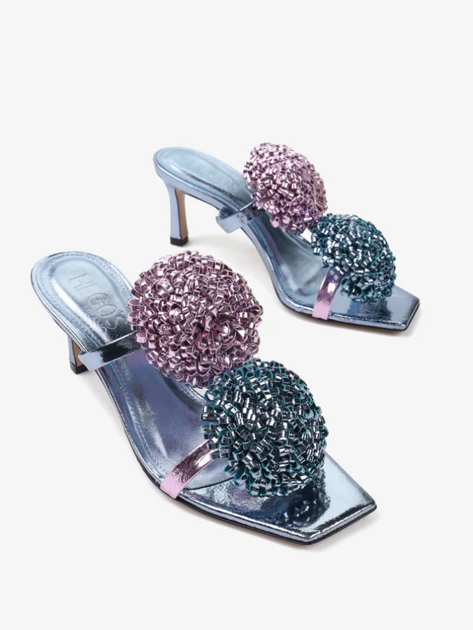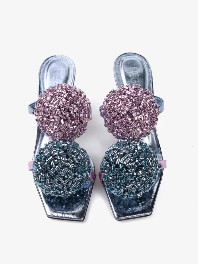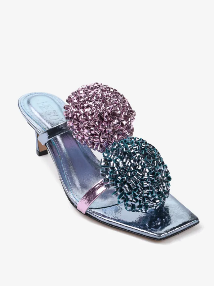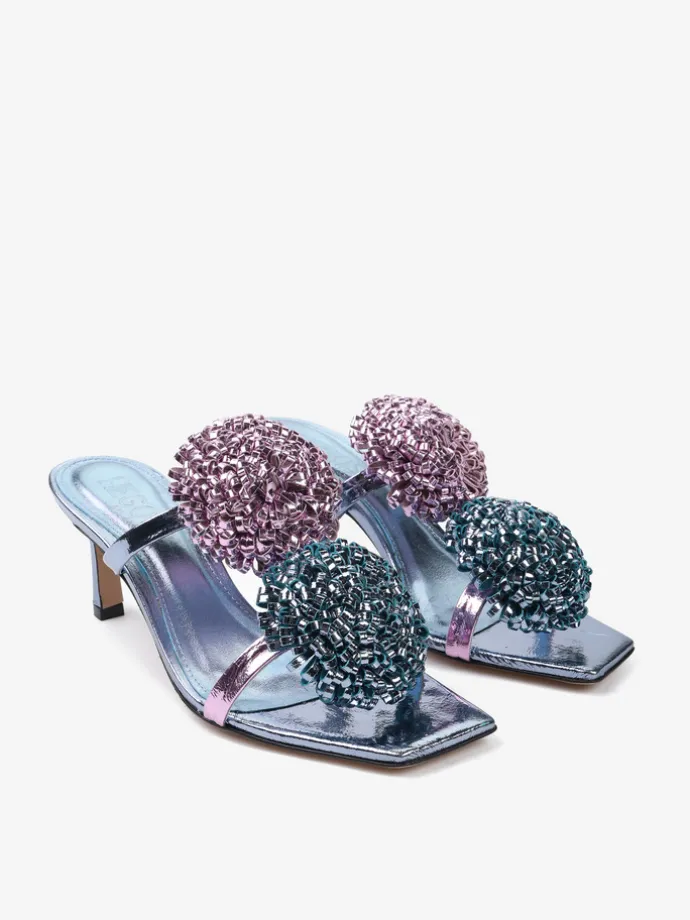 Klapki na szpilce wykonane z dwukolorowej metalizowanej skóry. Kwadratowy nosek i ozdobne pompony.