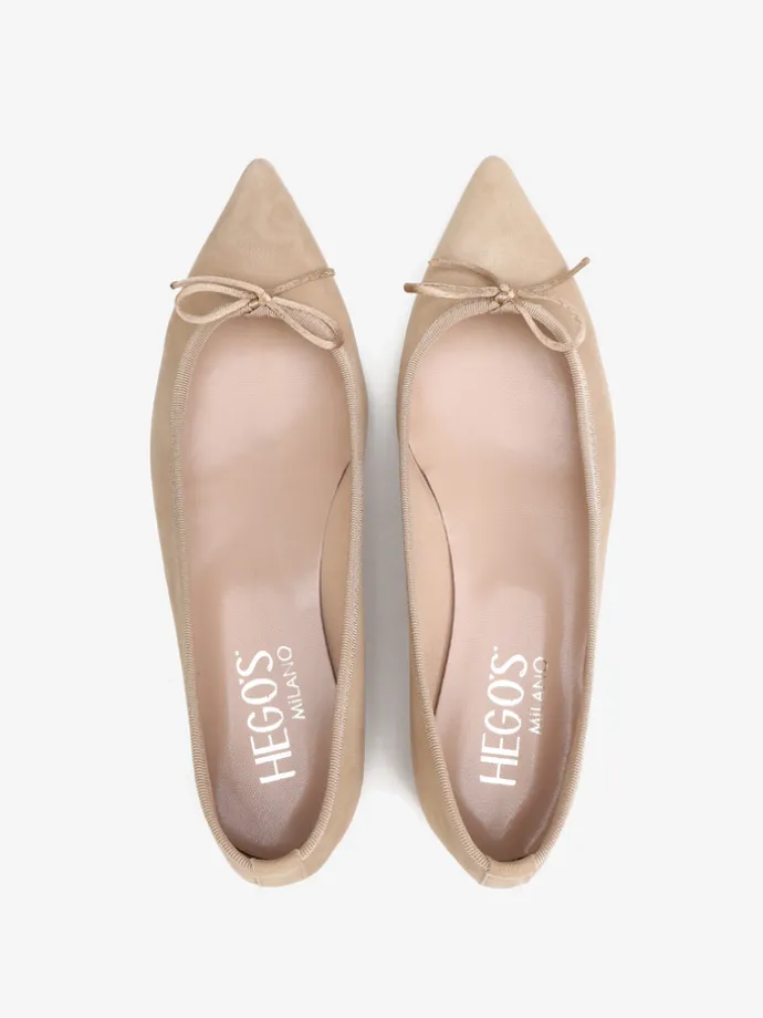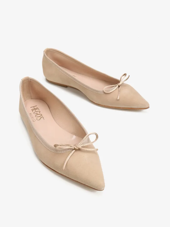 Baleriny z noskiem w szpic wykonane z modnego w tym sezonie zamszu. Wiązana kokardka umożliwia regulację dopasowania.