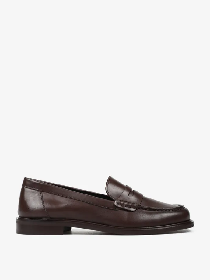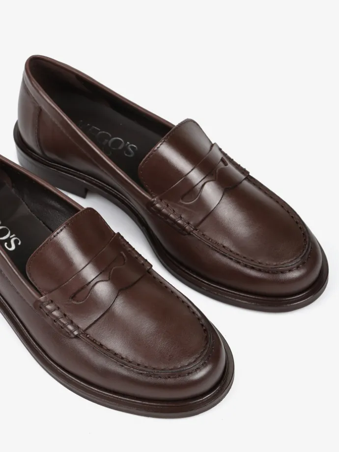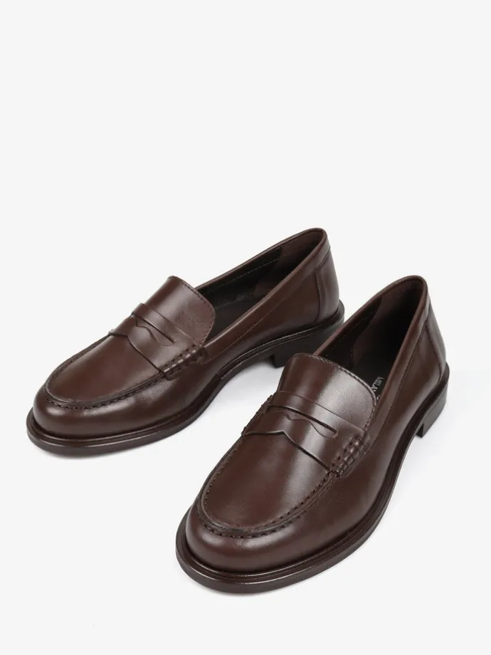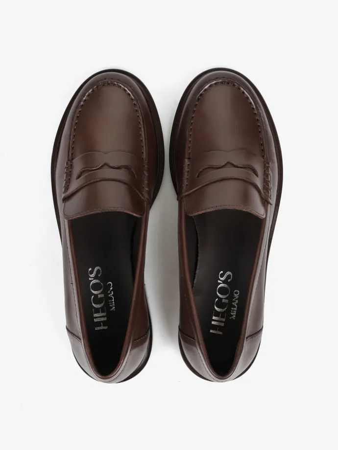 Skórzane, klasyczne mokasyny college z ozdobną patką i wysokim językiem.